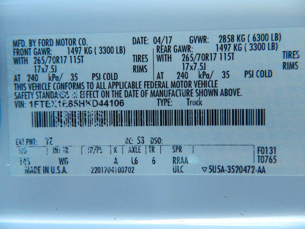 2017 Ford F-150 XL 4-wheel drive Extended Cab (SuperCab) with tt Trailer Tow Package. This is a very nice one-owner commercial truck with no accidents as reported by Carfax. It has the (non-turbo) 3.5L Flex Fuel V6 engine with 282hp and 253ft lbs of torque, electronic 6-speed automatic transmission with tow/haul, sport and manual shift modes, 4-wheel drive with traction control, a 3.73 electronic locking rear axle, steel wheels and a new set of tires. White with black trim, 6.5-foot bed with bed mat, parking sensors, rear receiver and front tow hooks. Interior has black vinyl flooring, gray cloth seats, seating for five, power windows, door locks and mirrors, good heat and cold A/C, sound system with AM/FM/AUX inputs, tilt and telescopic steering column, cruise control and more.