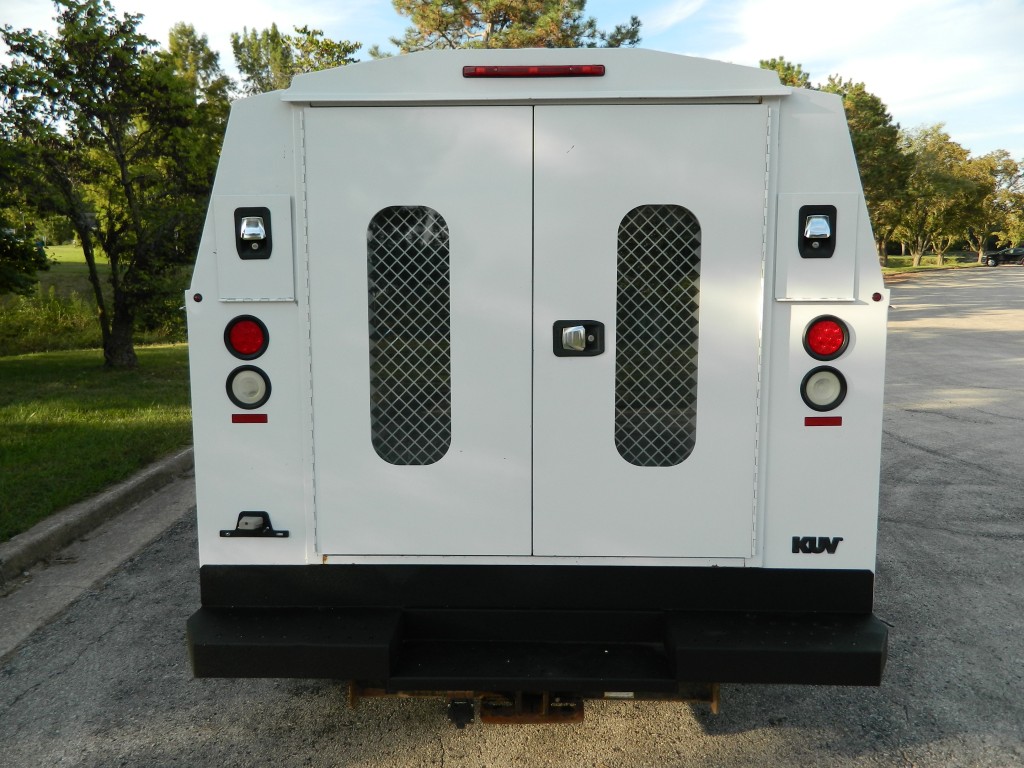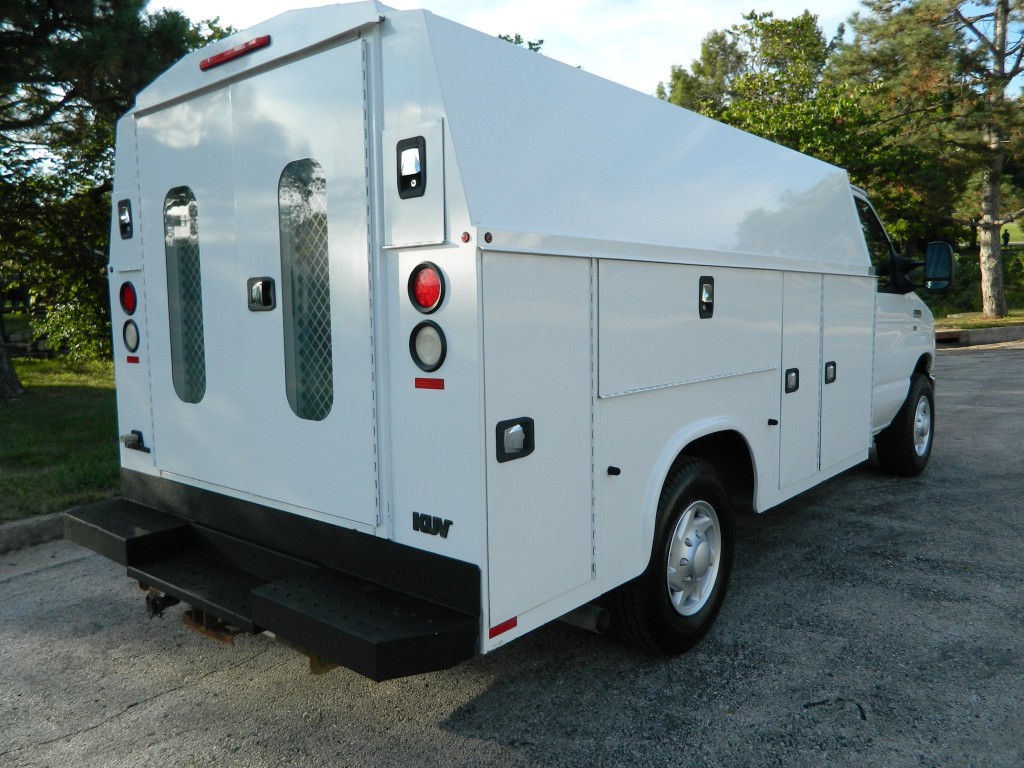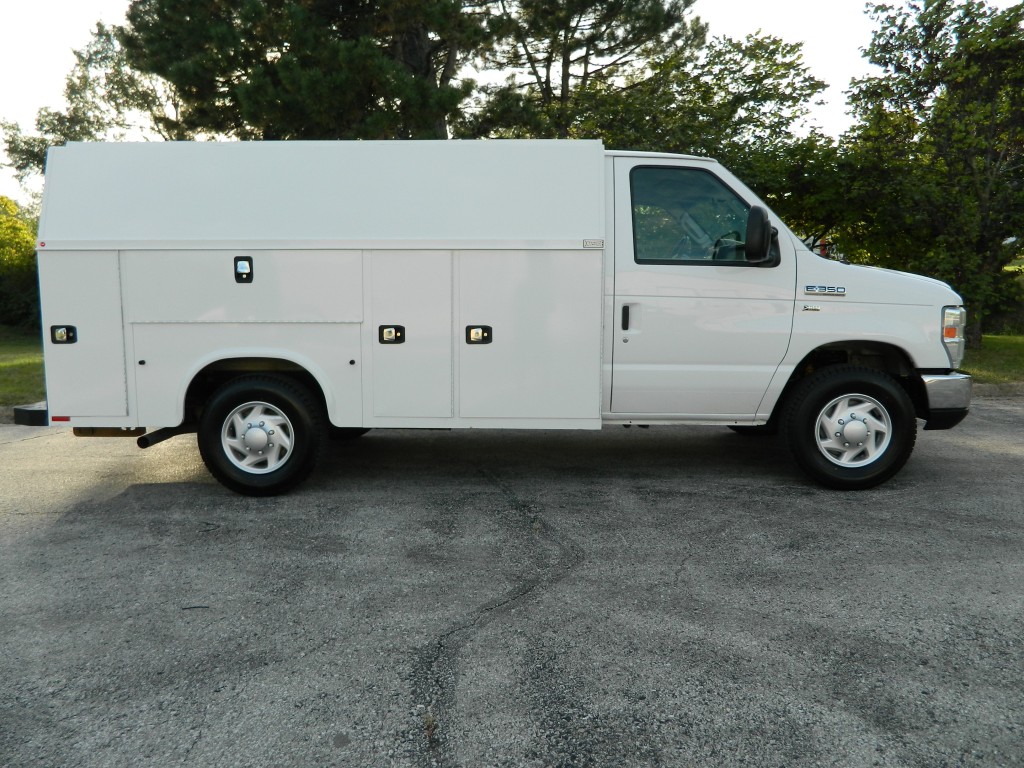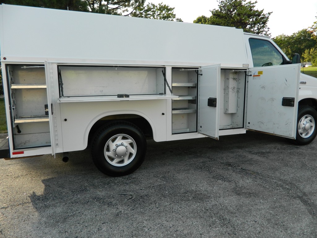 2016 Ford E-350 Cutaway van with a Knapheide KUV service body, 10050# GVWR and the Trailer Tow Package. This is a very nice, one-owner service van with a good service history. It has the 5.4L EFI V8 engine, electronic 5-speed automatic transmission with overdrive and tow/haul, rear wheel drive with traction control, a 4.10 limited slip rear axle (XE6), steel wheels and a new set of tires. White with chrome trim, chrome bumper, tow mirrors a rear receiver and a KUV body (Model KUV129SUKTPW-EL). Interior has black vinyl flooring, gray vinyl seats, seating for two, power windows, door locks and mirrors, good heat and cold A/C, sound system with AM/FM/AUX inputs, upfitter switches, tilt steering, cruise control and more.