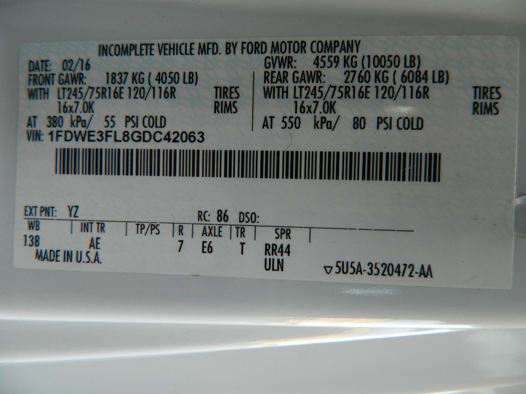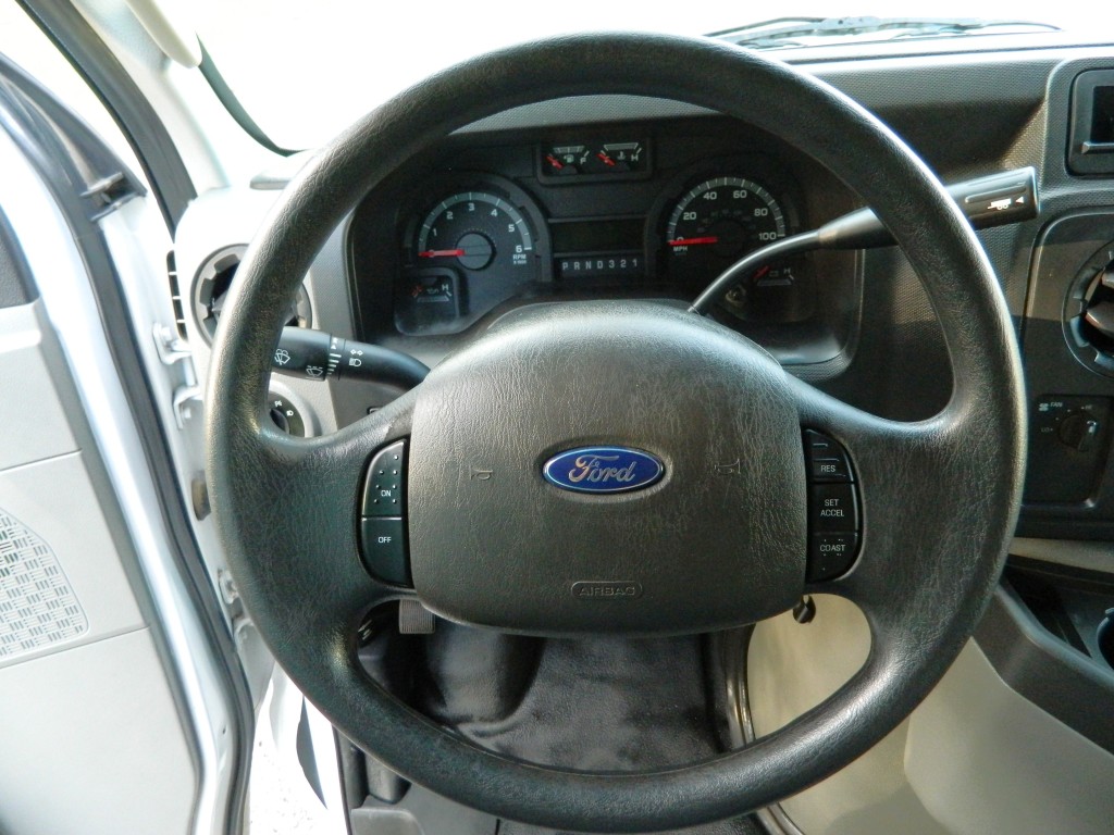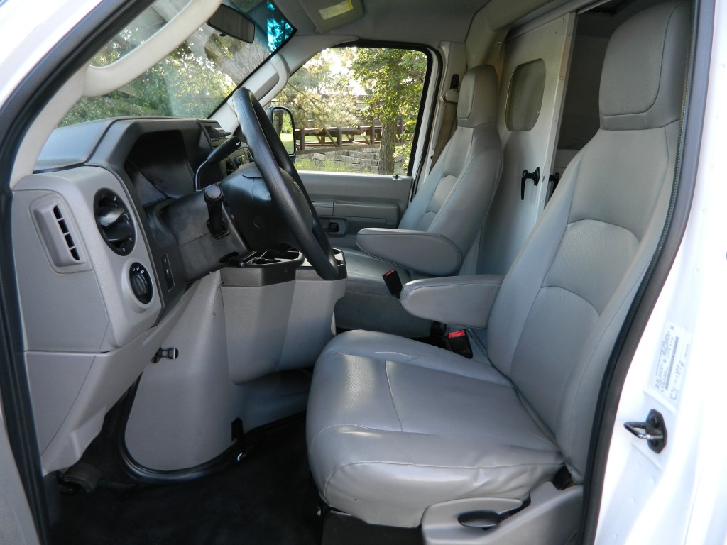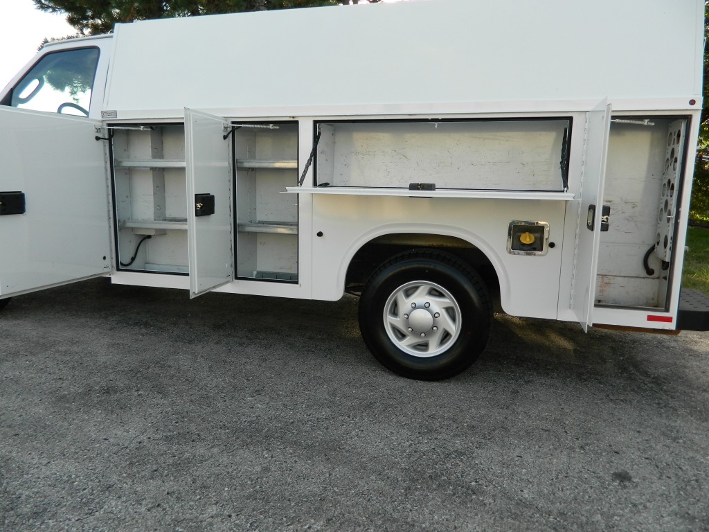 2016 Ford E-350 Cutaway van with a Knapheide KUV service body, 10050# GVWR and the Trailer Tow Package. This is a very nice, one-owner service van with a good service history. It has the 5.4L EFI V8 engine, electronic 5-speed automatic transmission with overdrive and tow/haul, rear wheel drive with traction control, a 4.10 limited slip rear axle (XE6), steel wheels and a new set of tires. White with chrome trim, chrome bumper, tow mirrors a rear receiver and a KUV body (Model KUV129SUKTPW-EL). Interior has black vinyl flooring, gray vinyl seats, seating for two, power windows, door locks and mirrors, good heat and cold A/C, sound system with AM/FM/AUX inputs, upfitter switches, tilt steering, cruise control and more.