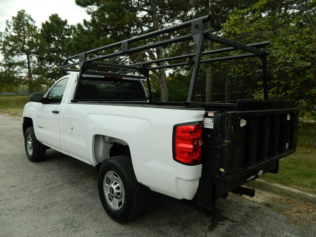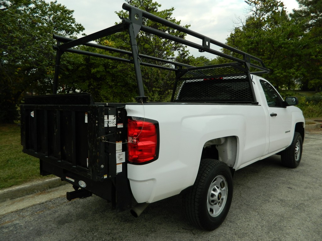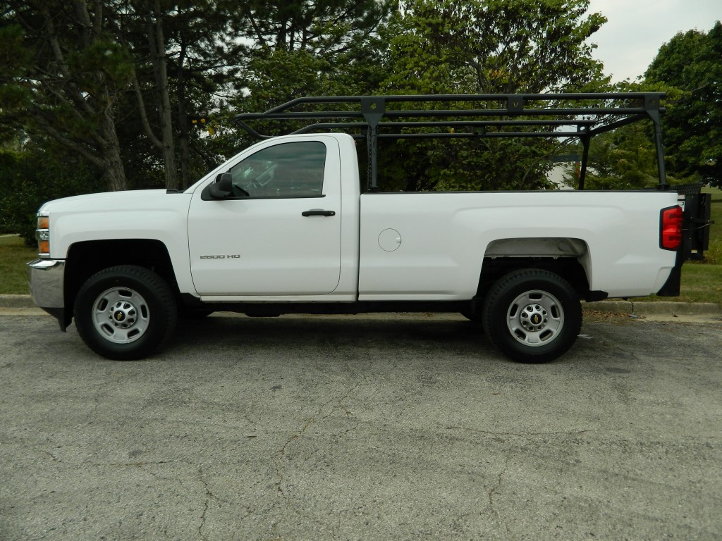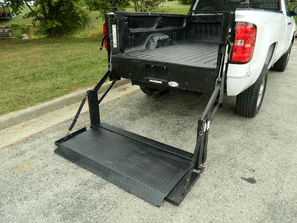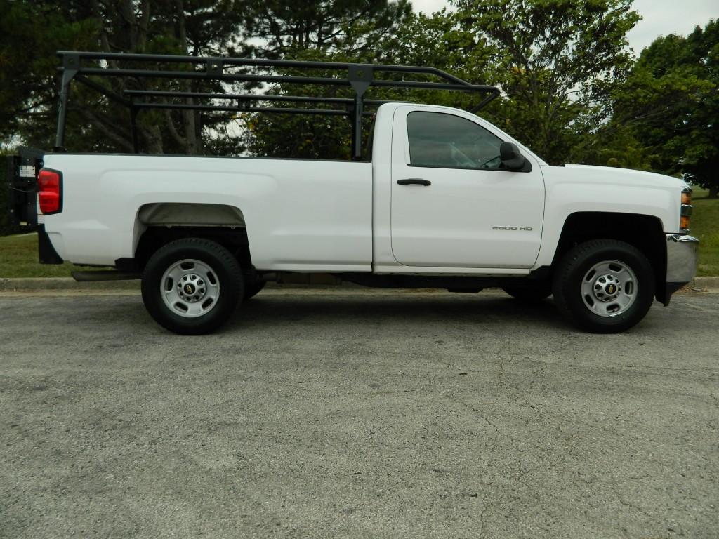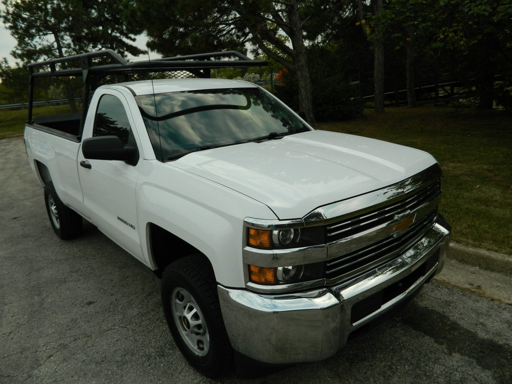 2015 Chevrolet Silverado 2500 Regular Cab Long Bed with Rear Wheel Drive, overhead pipe rack and a "Tommy Gate" hydraulic lift gate (1,300# capacity). This is a one-owner corporate truck with no accidents as reported by Carfax. It has the Vortec 6.0L Flex Fuel V8 engine with 360hp and 380ft lbs of torque, 6-speed automatic transmission (6L-90) with tow/haul and manual shift modes, Rear Wheel drive with traction control, a 4.10 rear axle, steel wheels and a new set of tires. White with chrome and black trim, chrome bumper, 8-foot bed with spray-in bed liner, overhead pipe rack, headache rack, 1,300# capacity "Tommy Gate" hydraulic lift gate, rear receiver, front tow hooks and an after-market trailer brake controller (Reese "Brakeman Digital"). Interior has black vinyl flooring, gray vinyl seats, seating for three, power windows, door locks and mirrors, good heat and cold A/C, sound system with AM/FM/SD/USB/AUX inputs, tilt steering, cruise control and more.