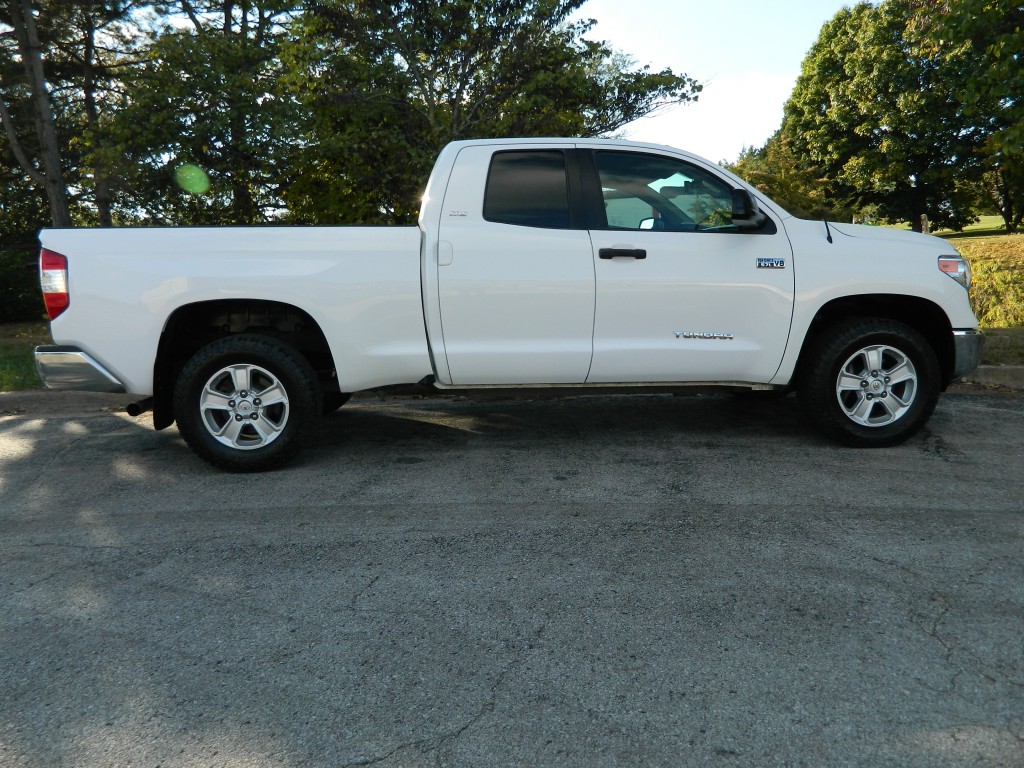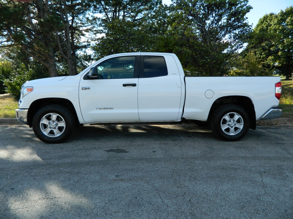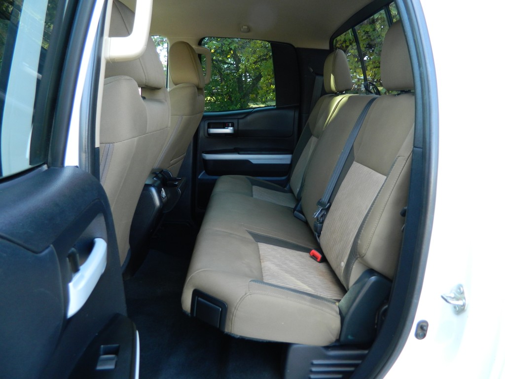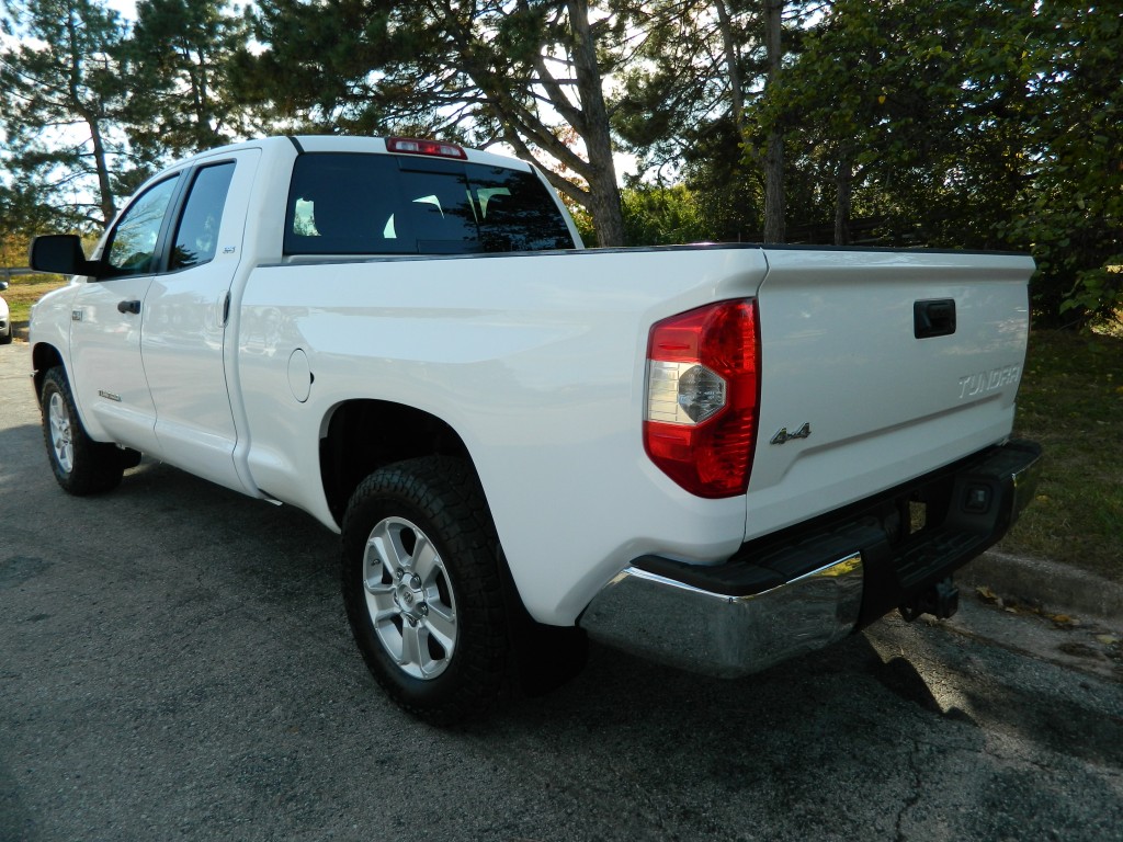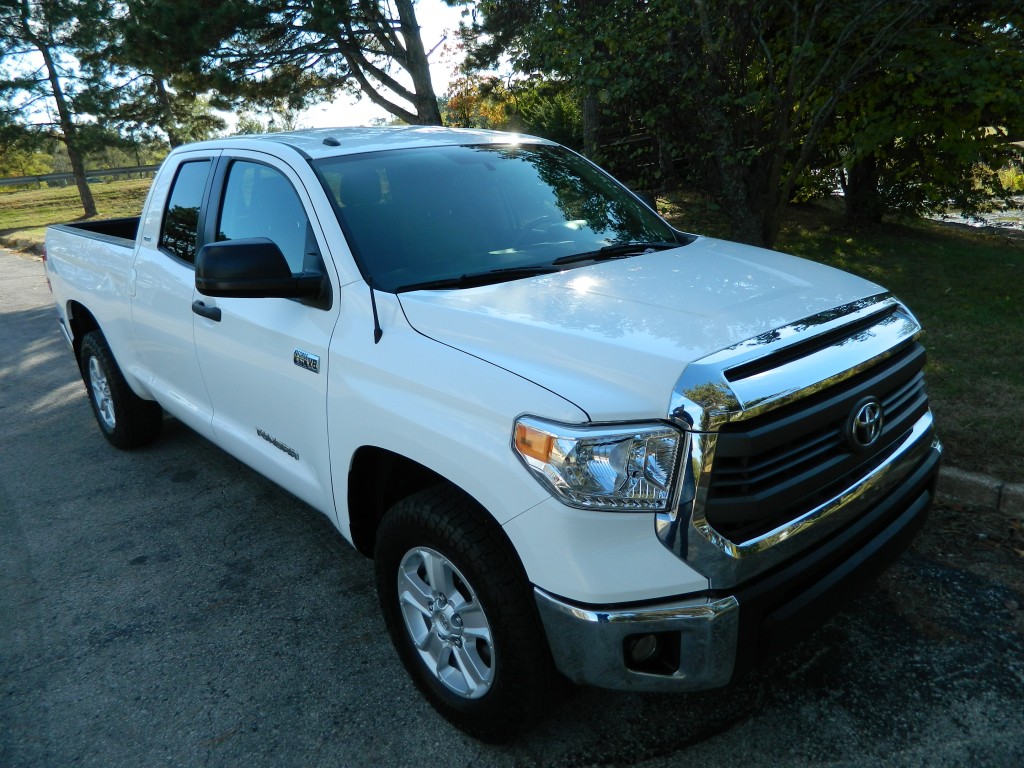 2014 Toyota Tundra SR5 Double Cab with 4-wheel drive.  This is a very well-service Tundra with low miles, very clean and no rust.  It has the 5.7L Flex Fuel V8 engine with 381hp and 401ft lbs of torque, automatic transmission with tow/haul and manual shift modes, 4-wheel drive with traction control, alloy wheels and a new set of tires.  White with chrome trim, fog lights, 6.5-ft bed with bed liner, rear view camera, rear receiver, front tow hooks.  Interior has beige carpet and cloth seats, seating for five, powered driver's seat, power windows, door locks and mirrors, good heat and cold A/C, sound system with AM/FM/SAT/CD/USB/AUX/BT inputs, tilt and telescopic steering column, steering wheel controls, cruise control and more.