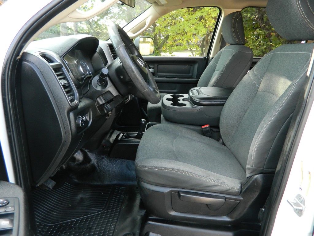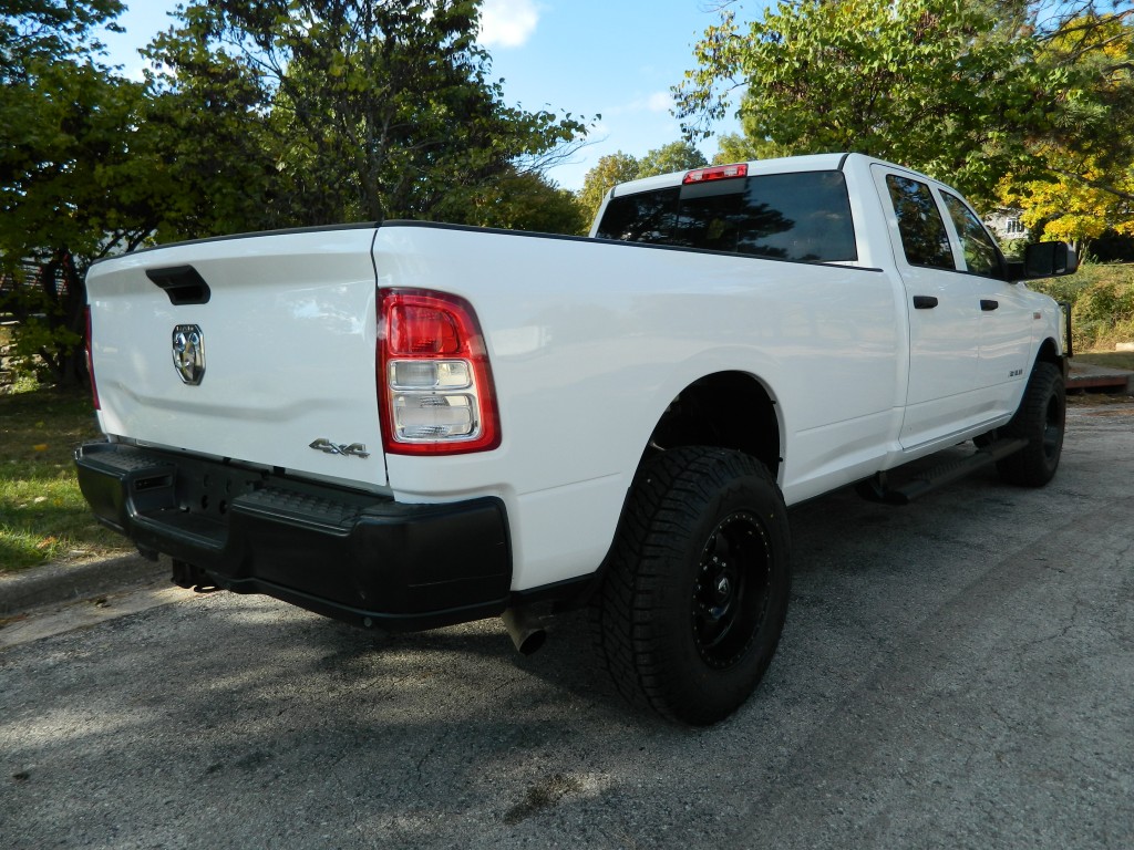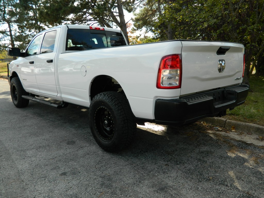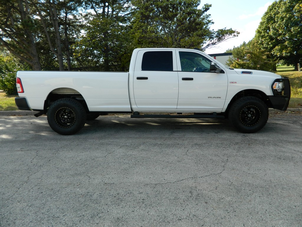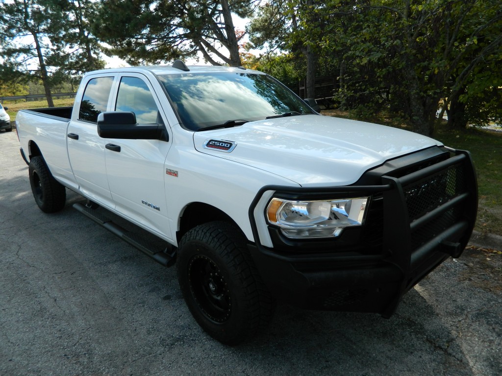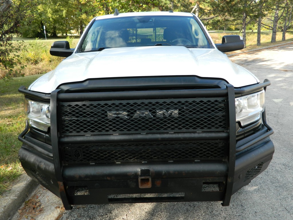2019 Ram 2500 Tradesman Crew Cab with 4-wheel drive, an 8-foot bed and no accidents reported by Carfax.  It has the 6.4L V8 Hemi engine with 410hp and 429ft lbs of torque, 8-speed automatic transmission (8HP75-LCV) with tow/haul mode, 4-wheel drive with traction control, a 4.10 anti-spin rear axle, custom alloy wheels by "Fuel" and a NEW set of tires (LT 285/75R18).  White with black trim, heavy-duty cattle guard with integrated bumper, running boards, 8-foot bed with bed liner, goose neck ball, rear view camera, rear receiver, tow mirrors, and a built-in trailer brake controller.  Interior has black vinyl flooring, black cloth seats, seating for six, power windows, door locks and mirrors, good heat and cold A/C, 5" display, sound system with AM/FM/USB/AUX/BT inputs, tilt steering, cruise control and more.
