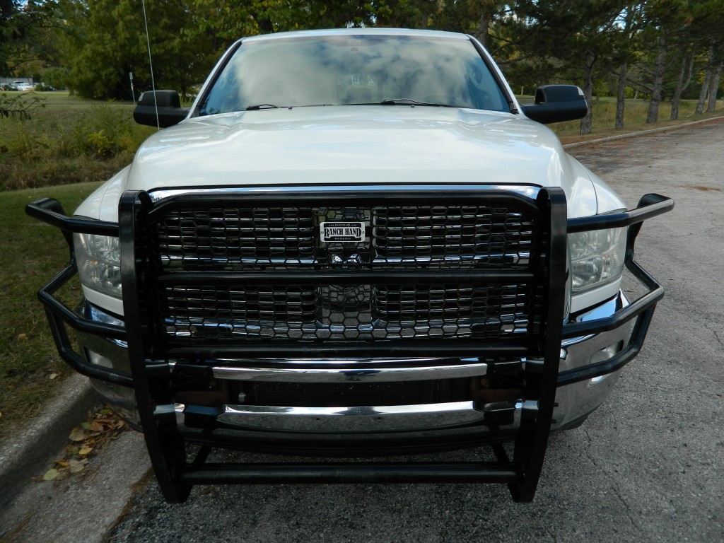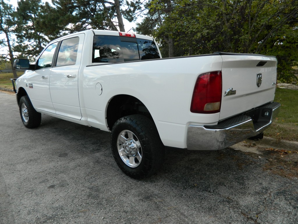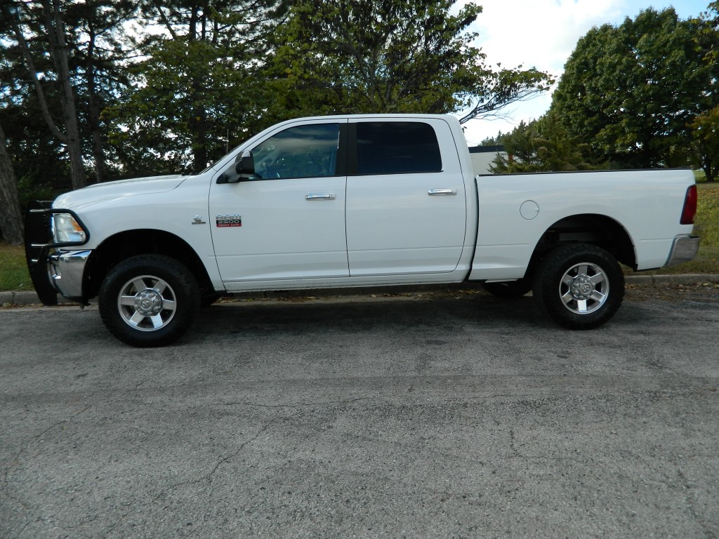 2010 Ram 2500 SLT Crew Cab, 4-wheel drive with the Big Horn package and an excellent service history.  It has the Cummins 6.7L Diesel Turbo I6 engine with 350hp and 650ft lbs of torque, exhaust brake, 6-speed automatic transmission (68RFE) with tow/haul and manual shift modes, transmission oil cooler, 4-wheel drive, a 3.73 Anti-Spin rear axle, aluminum alloy wheels and an excellent set of tires.  White with chrome and black trim, chrome bumpers, "Ranch Hand" cattle guard, fog lights, 6.5-ft bed with goose neck ball, rear receiver, a built-in trailer brake controller and an exhaust brake.  Interior has black carpet, beige cloth seats, seating for six, powered driver's seat, power windows, door locks and mirrors, good heat and cold A/C, 150 Watt power inverter, sound system with AM/FM/SAT/CD/AUX inputs, tilt steering, steering wheel controls, cruise control and more.