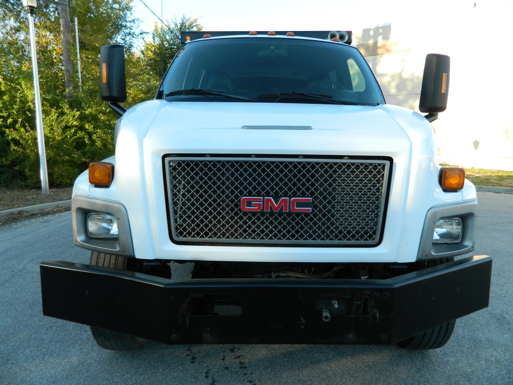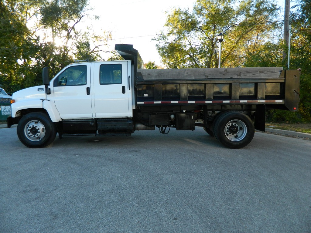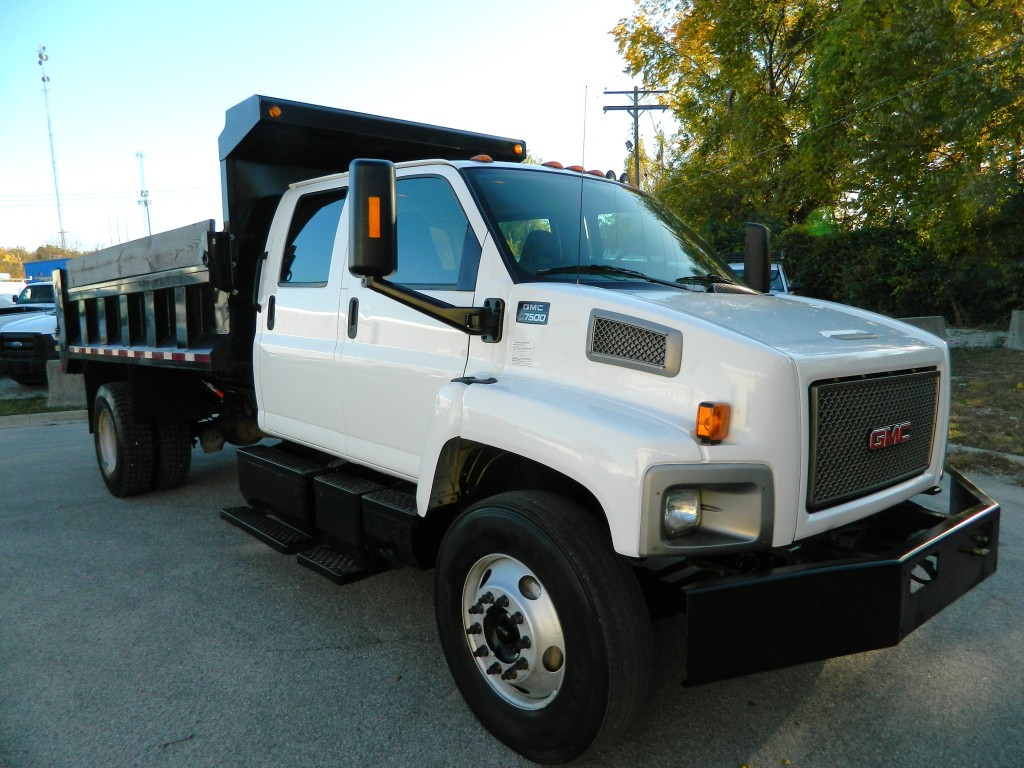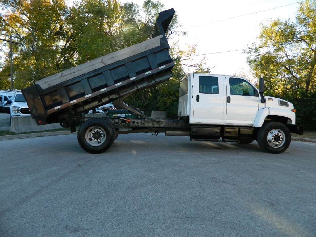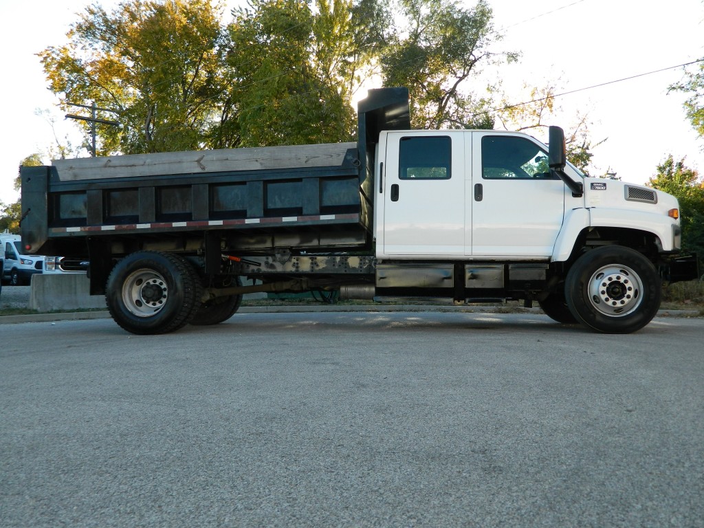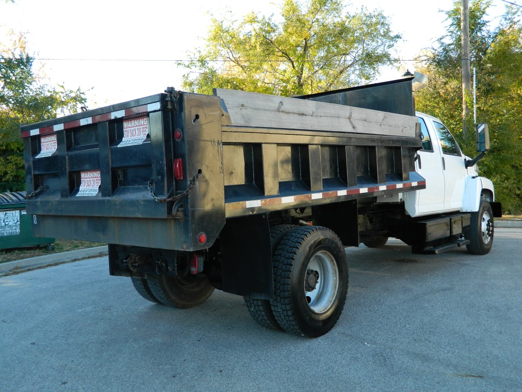 2005 GMC C7500 Crew Cab Class 7, (33,000#), straight truck with good tires, a good running 7.2L Caterpillar diesel engine, automatic transmission and a PTO-driven hydraulic system for the dump bed, and is also plumbed for a snow plow (plow not included). The dump bed is a Godwin 400U (about 7 cu.yd.) with side boards.