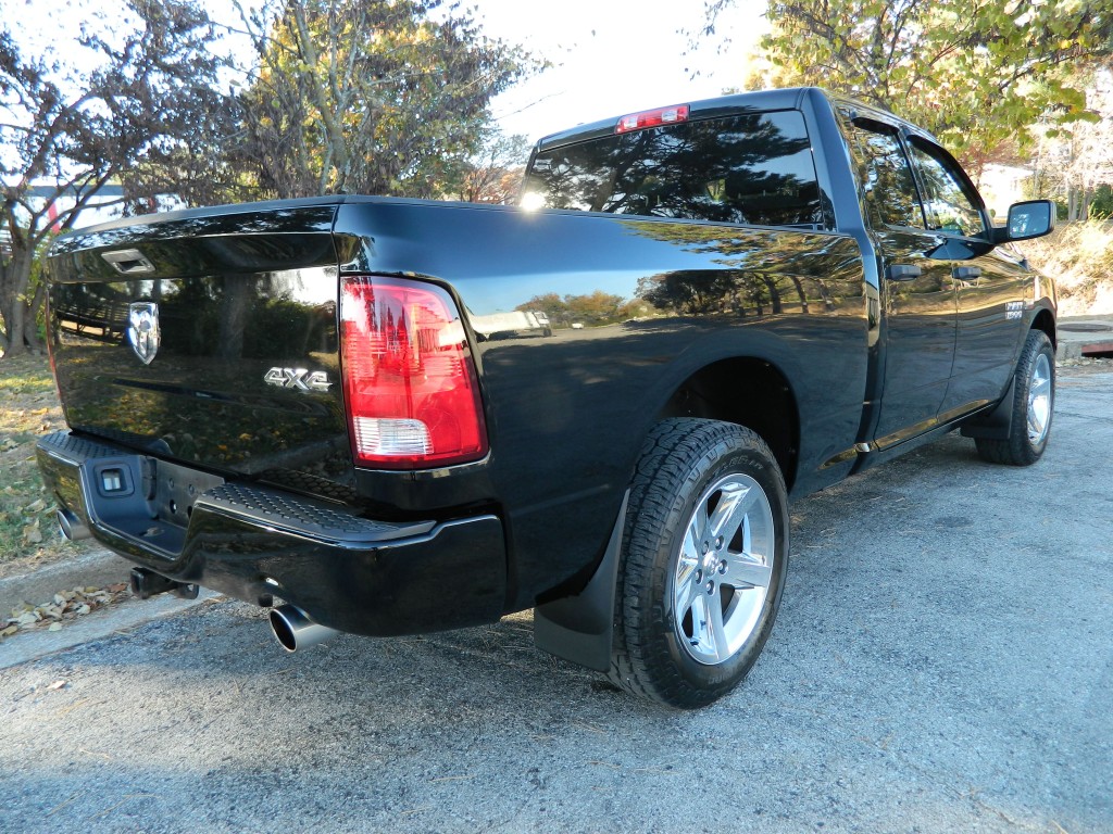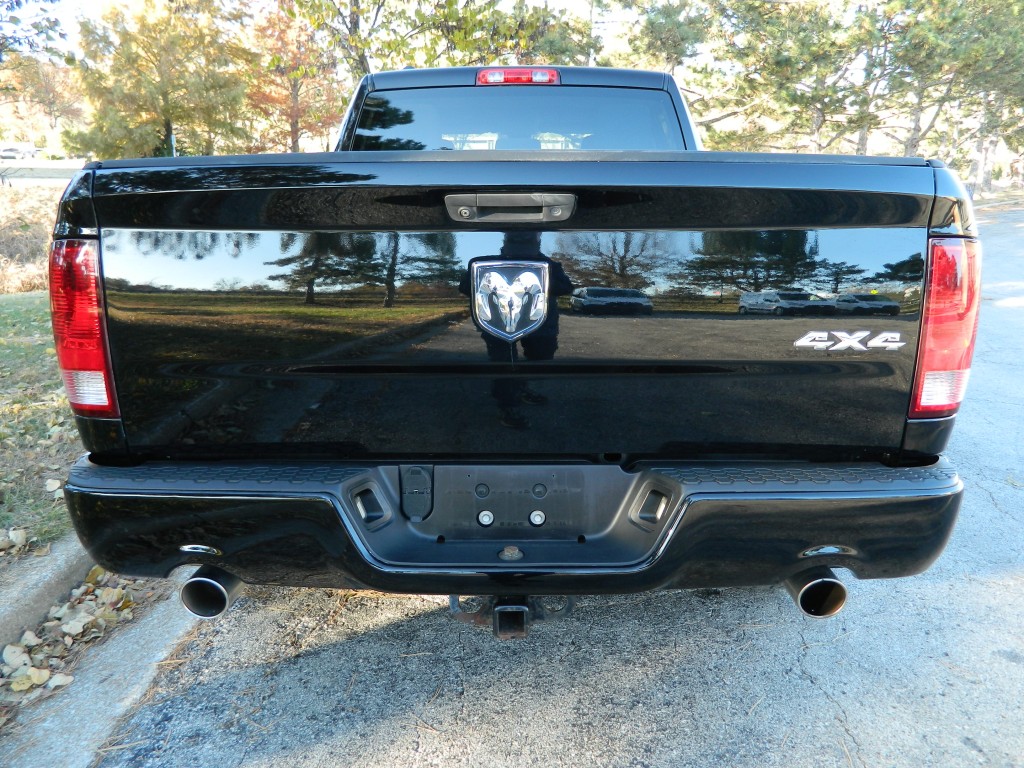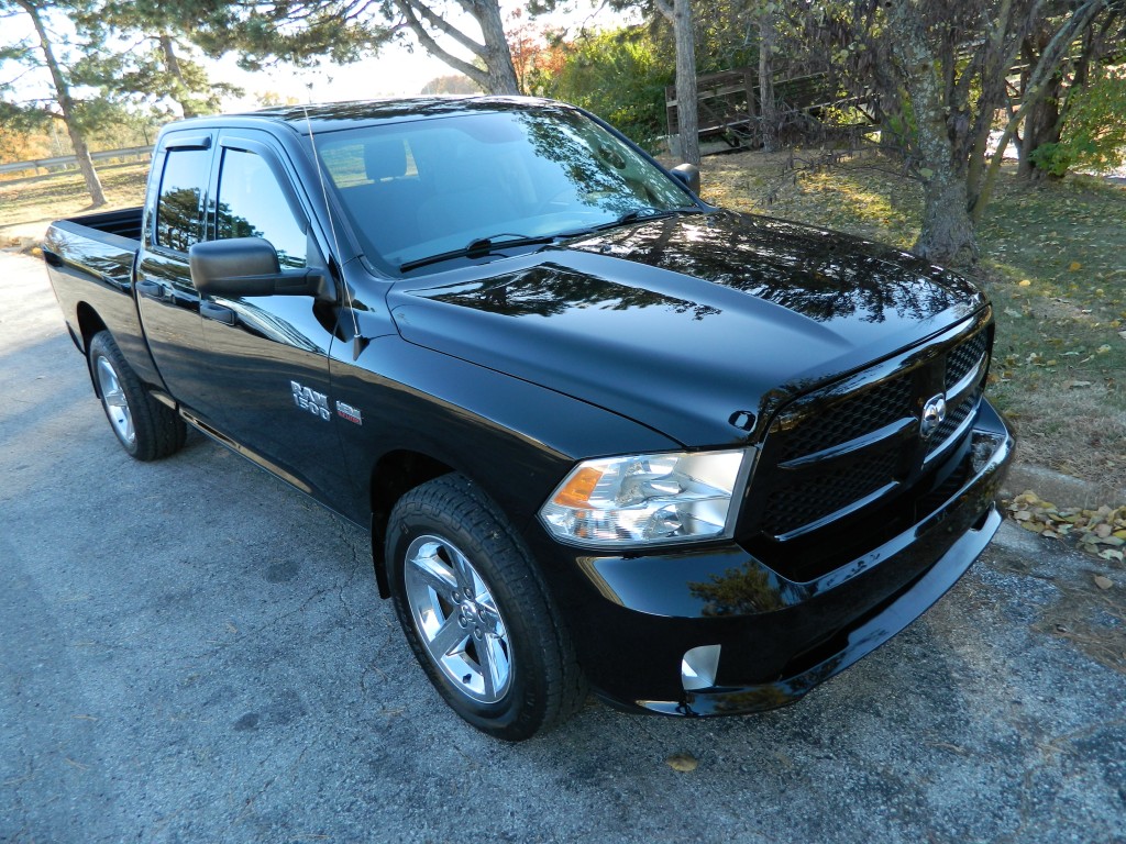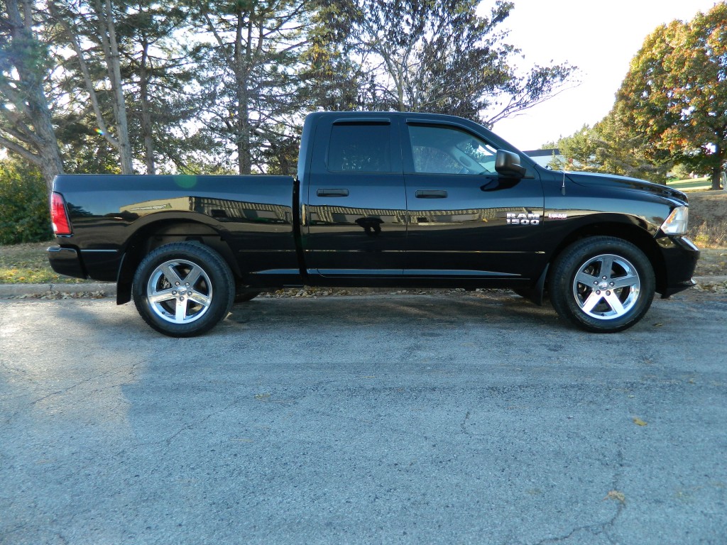 2014 Ram 1500 Express Quad Cab with 4-wheel drive, one owner, new tires. This is a very nice, one-owner truck in excellent condition. It has the 5.7L V8 Hemi engine with 395hp and 407ft lbs of torque, the 8-speed automatic transmission (8HP70) with tow/haul mode, 4-wheel drive with traction control, a 3.21 axle ratio, aluminum chrome clad wheels and a new set of tires. Black with paint-matched trim, fog lights, 6-ft pickup box, rear receiver and a built-in trailer brake controller. Interior has black carpet, gray cloth seats, seating for six, power windows, door locks and mirrors, good heat and cold A/C, sound system with AM/FM/SAT/USB/AUX inputs, tilt steering, cruise control and more.