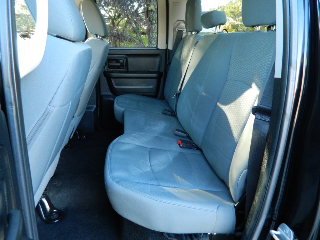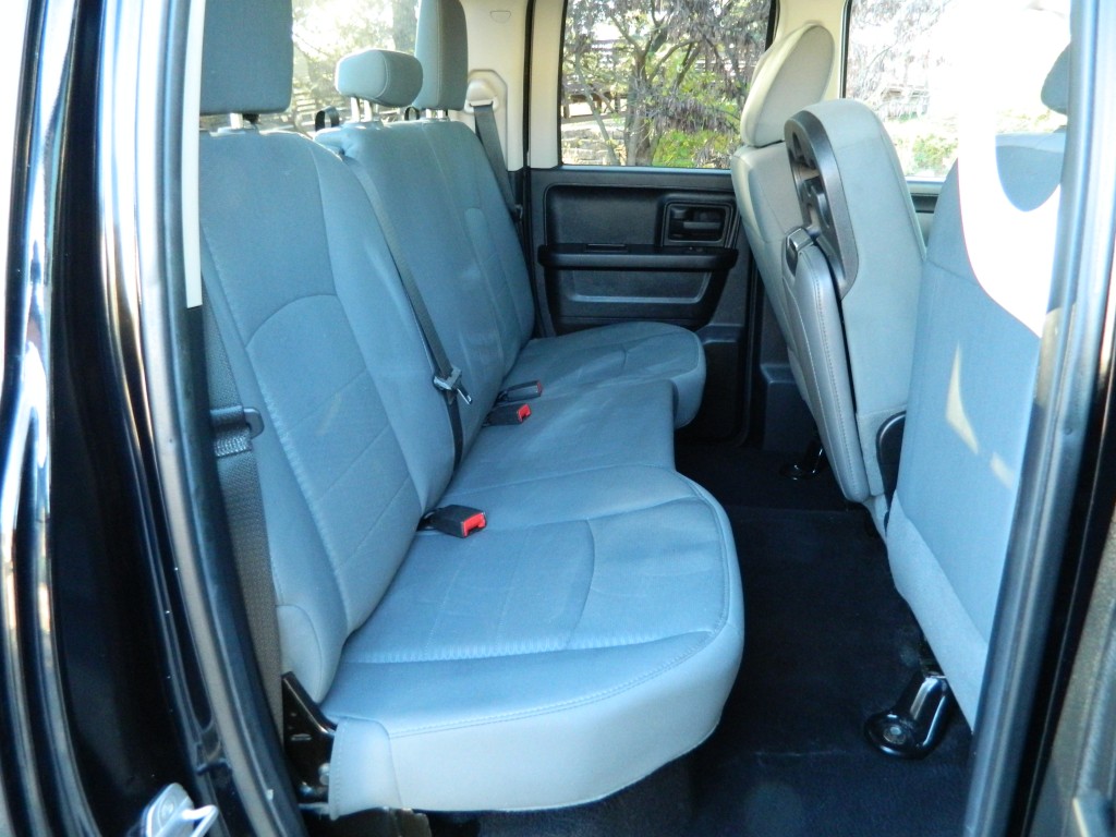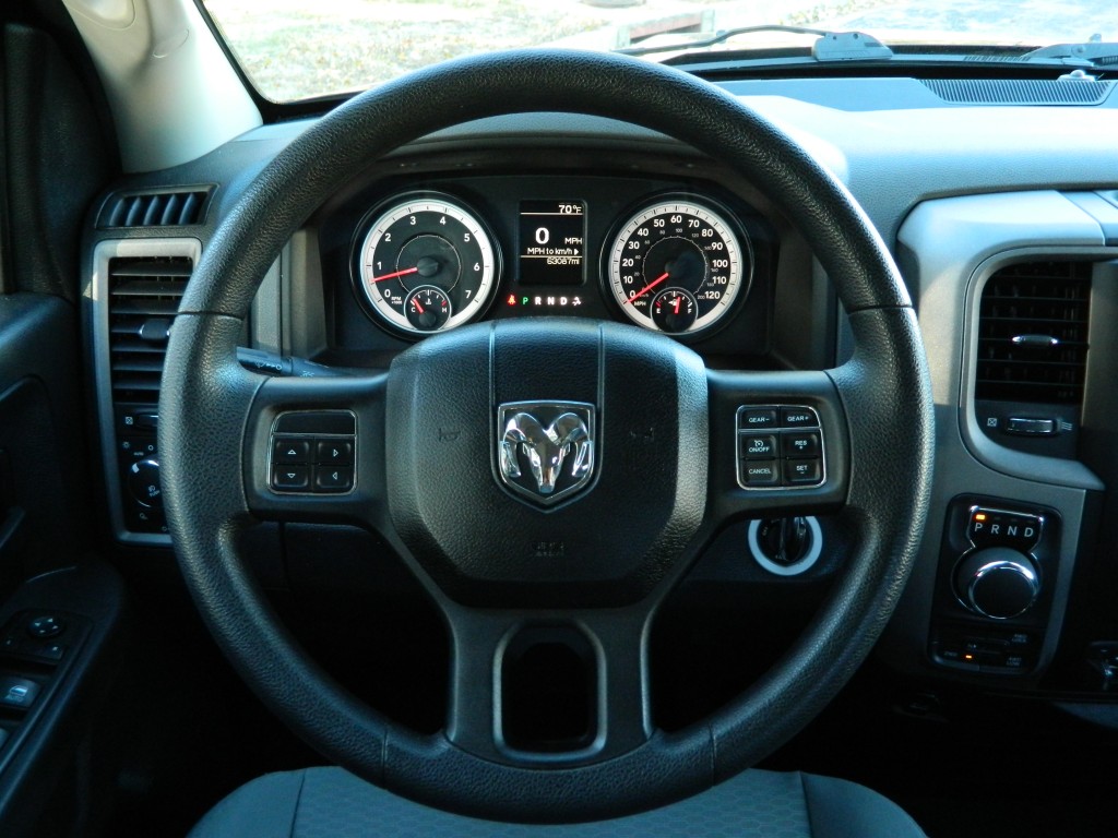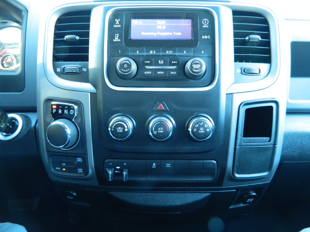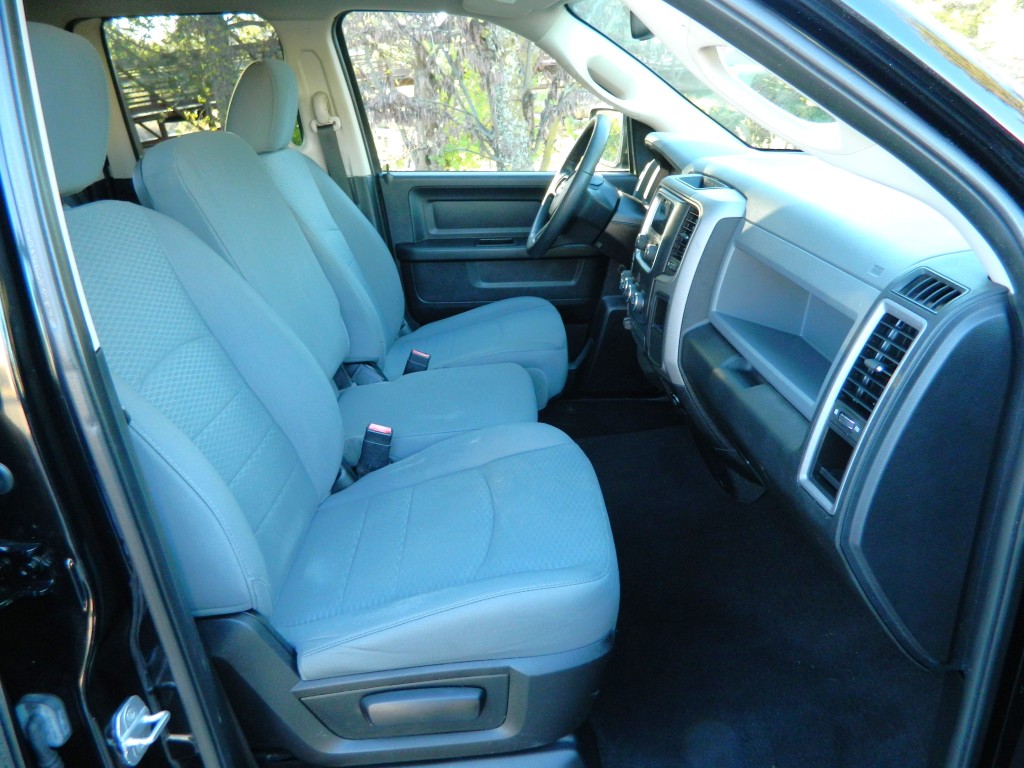 2014 Ram 1500 Express Quad Cab with 4-wheel drive, one owner, new tires. This is a very nice, one-owner truck in excellent condition. It has the 5.7L V8 Hemi engine with 395hp and 407ft lbs of torque, the 8-speed automatic transmission (8HP70) with tow/haul mode, 4-wheel drive with traction control, a 3.21 axle ratio, aluminum chrome clad wheels and a new set of tires. Black with paint-matched trim, fog lights, 6-ft pickup box, rear receiver and a built-in trailer brake controller. Interior has black carpet, gray cloth seats, seating for six, power windows, door locks and mirrors, good heat and cold A/C, sound system with AM/FM/SAT/USB/AUX inputs, tilt steering, cruise control and more.