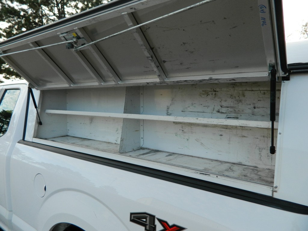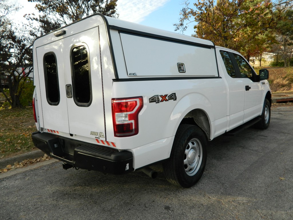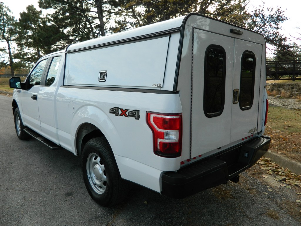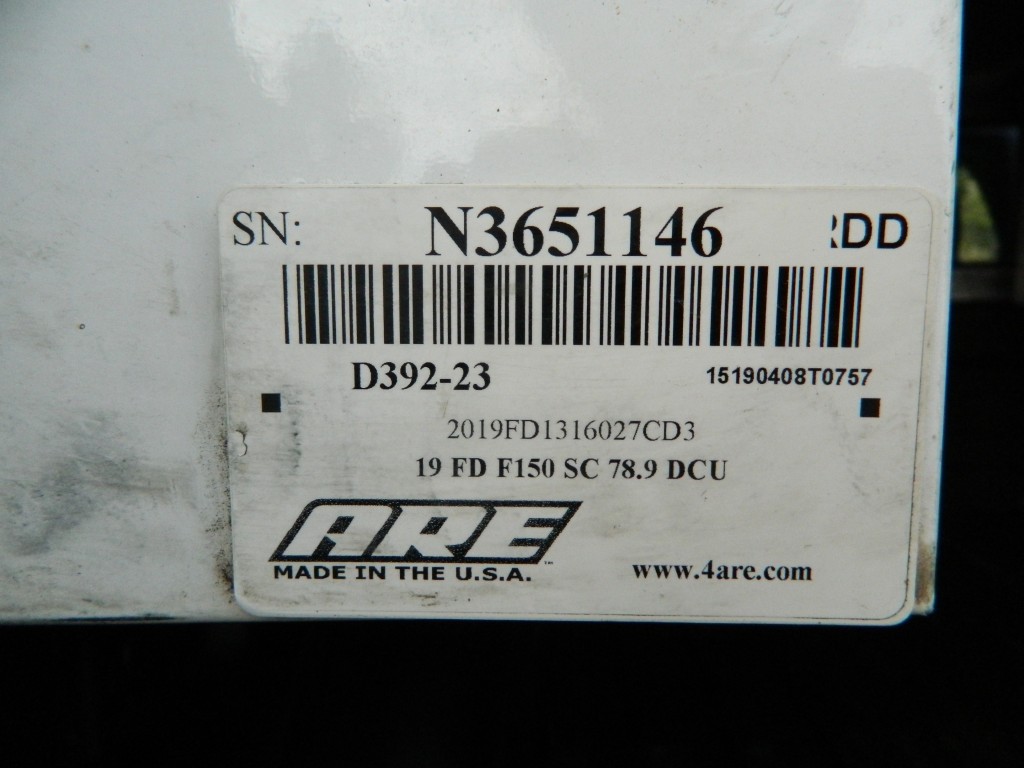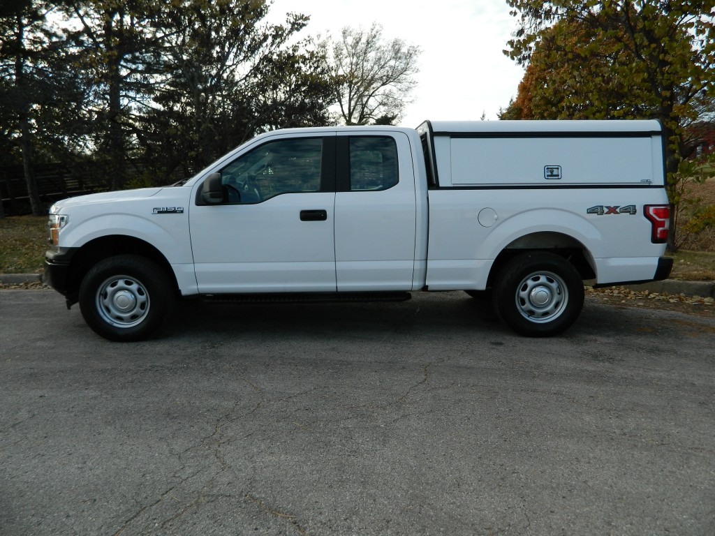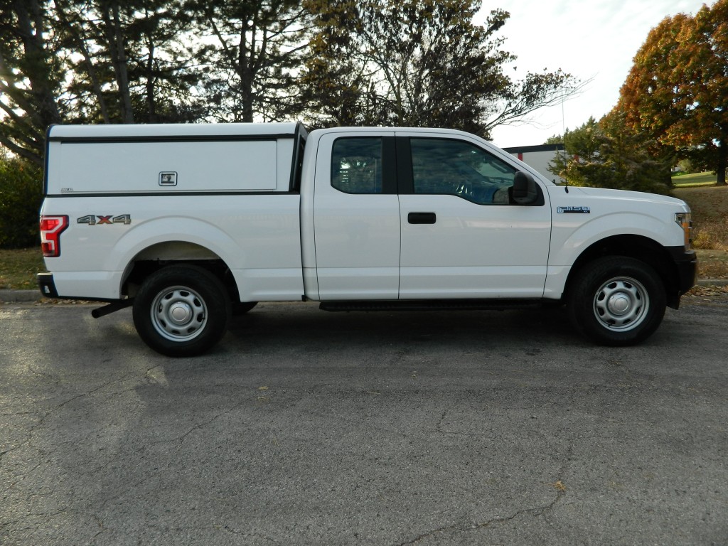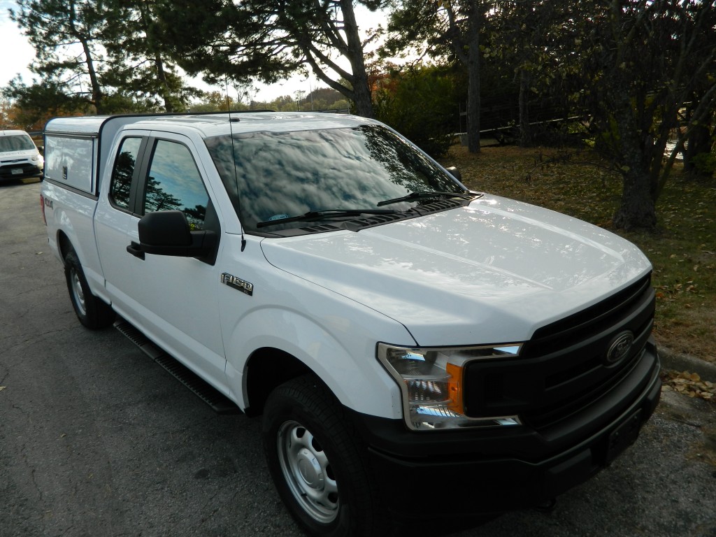 2019 Ford F-150 XL Extended Cab (SuperCab) with 4-wheel drive, XL Power Equipment Group, Trailer Tow Package, 6500# GVWR. It has the 2.7L Twin Turbo V6 EcoBoost engine with 325hp and 400ft lbs of torque, electronic 10-speed automatic transmission with manual shift and multiple driver modes, 4-wheel drive with traction control, a 3.55 electronic locking rear axle, steel wheels and an excellent set of Pirelli tires. White with black trim, rear view camera, 6.5-foot bed with a Ford Factory spray-in bed liner, an ARE model D392-23 work shell with keys, front tow hooks, rear receiver and a built-in trailer brake controller. Interior has black vinyl flooring, gray cloth seats, seating for six, power windows, door locks and mirrors, good heat and cold A/C, sound system with AM/FM/USB/BT inputs, tilt and telescopic steering column, steering wheel controls, cruise control and more.
