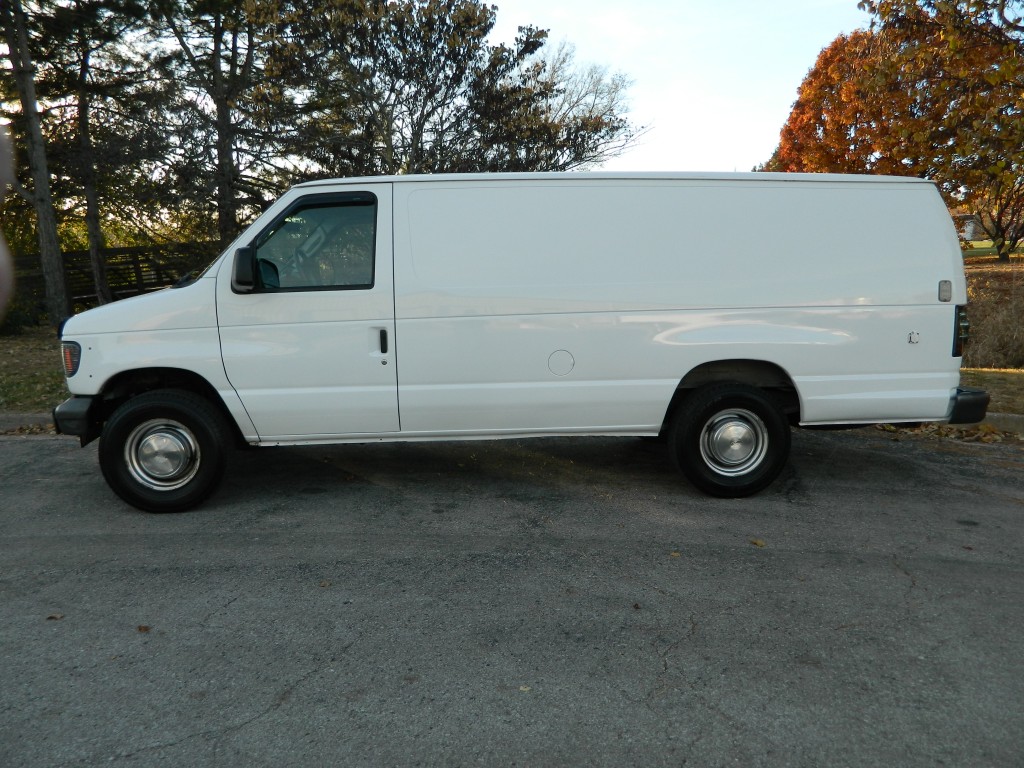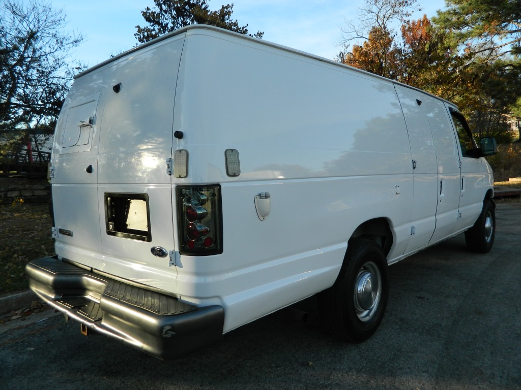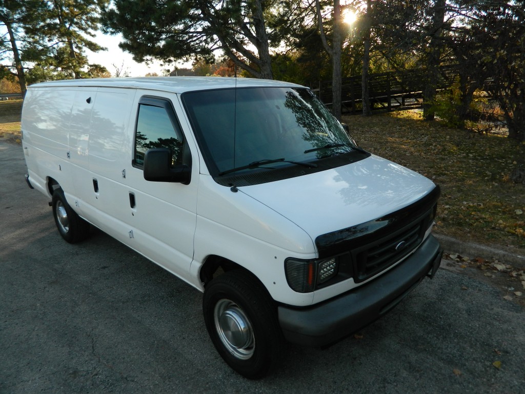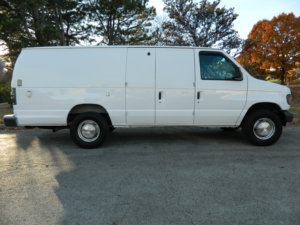 2006 Ford Econoline E250 Extended length Cargo Van, 138" wheel base, 8600# GVWR, excellent service history, very clean and straight, no rust. It has the Triton 4.6L V8 engine with 225hp and 286ft lbs of torque, 4-speed automatic transmission (4R75E) with overdrive, rear wheel drive, a 3.73 limited slip rear axle, steel wheels and a good set of tires. White with black trim, upgraded head lights and tail lights, no glass in the cargo area, rear receiver. Cargo area has black vinyl flooring, included equipment is a pair of roof racks with drip rail mounting and a partially dis-assembled steel divider for protecting the passengers. Passenger area has black vinyl flooring, gray vinyl seats, seating for two, power windows, door locks and mirrors, front and rear climate controls, sound system with AM/FM inputs, tilt steering and more.