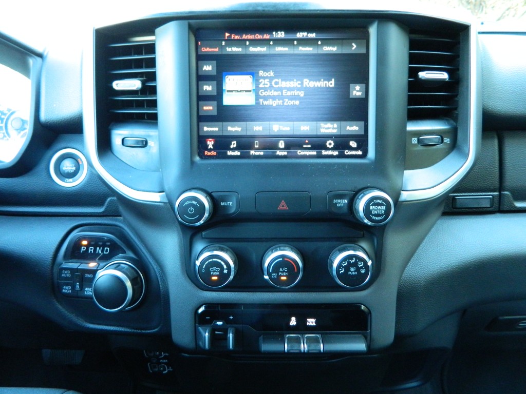 2021 Ram 1500 4x4 Crew Cab with a 6-ft bed, 26 Gal Fuel Tank, the Big Horn Package (25Z) and the Big Horn Level 1 Equipment group, good service history and no accidents as reported by Carfax. It has the 5.7L V8 Hemi engine with 395hp and 410ft lbs of torque, 8-speed automatic transmission (8HP75) with tow/haul mode, 4-wheel drive with traction control, 3.21 axle ratio, alloy wheels and an excellent set of tires. White with chrome trim, fog lights, running boards, 6-ft bed with spray-in bed liner, soft bed cover, rear receiver and a built-in trailer brake controller. Interior has black carpet, gray cloth seats, seating for six, powered driver's seat, power windows, door locks and mirrors, good heat and cold A/C, 8.4" touch screen display, sound system with AM/FM/SAT/USB/AUX/BT inputs, UConnect, tilt and telescopic steering column, steering wheel controls, cruise control and more.