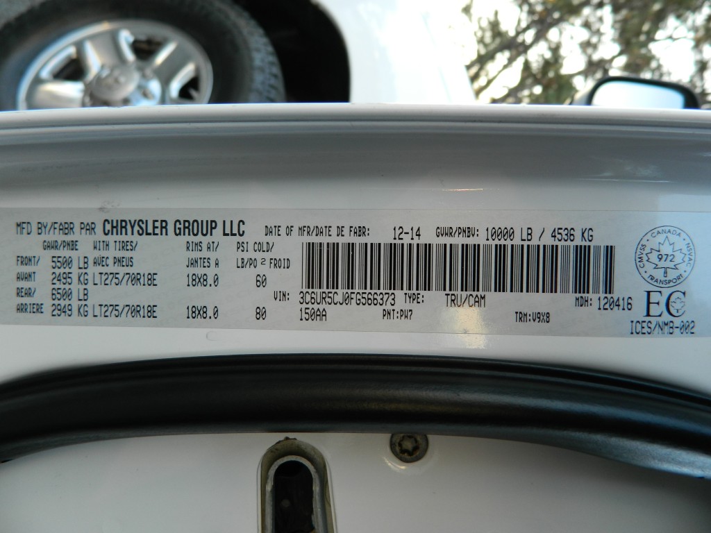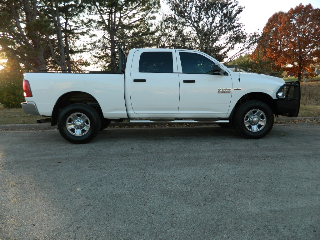 2015 Ram 2500 ST Crew Cab with 4-wheel drive, the SXT appearance group, 6.4 ft bed, tow package, 10000# GVWR, excellent service history and no accidents as reported by Carfax. It has the 6.4L V8 Hemi engine with 410hp and 429ft lbs of torque, 6-speed automatic transmission (66RFE) with tow/haul mode, 4-wheel drive with traction control, a 3.73 anti-spin rear axle, chrome clad steel wheels and a new set of tires. White with chrome and black trim, heavy duty cattle guard with integrated steel bumper, fog lights, running boards, 6.4-ft bed with Line-X spray-in bed liner, rear view camera, rear receiver and a built-in trailer brake controller. Interior has black vinyl flooring, gray cloth seats, seating for six, power windows, door locks and mirrors, up-fitter switches, after-market 1000 watt power inverter, good heat and cold A/C, sound system with AM/FM/SAT/USB/AUX/BT inputs, UConnect 3 with 5" display, tilt steering, steering wheel controls, cruise control and more.
