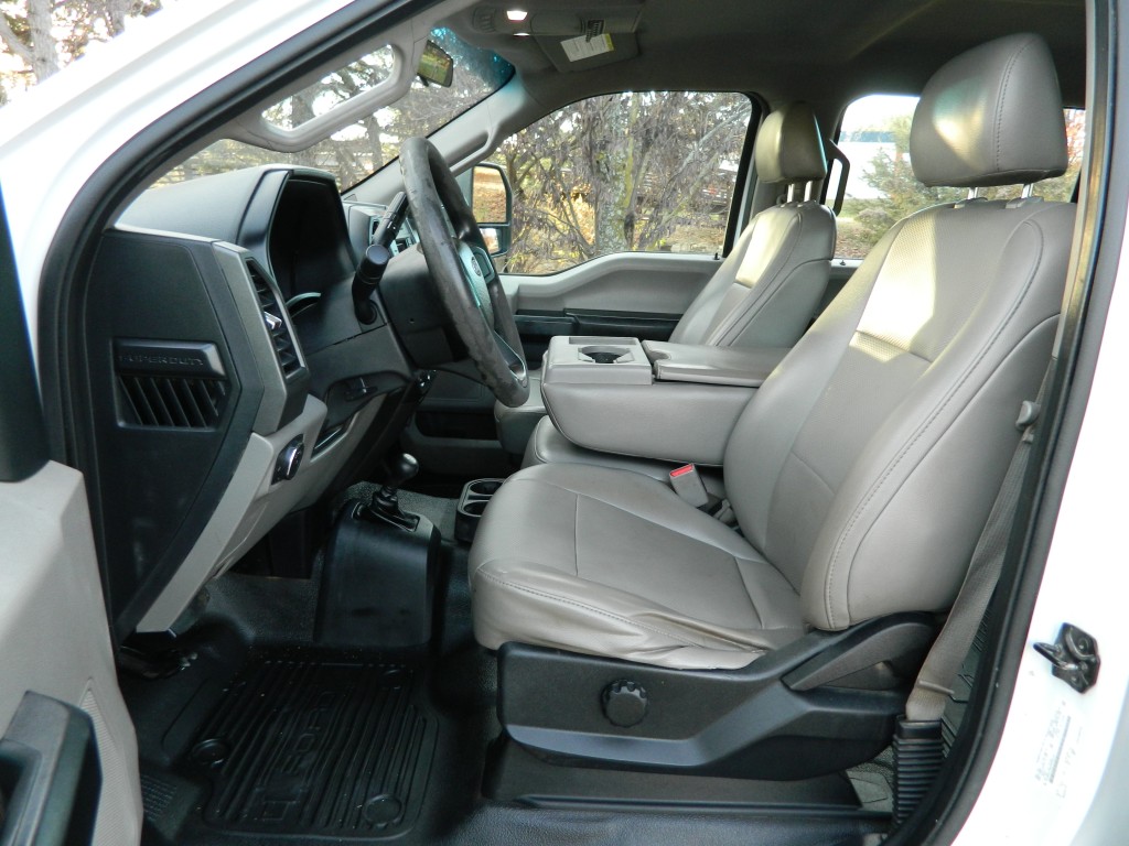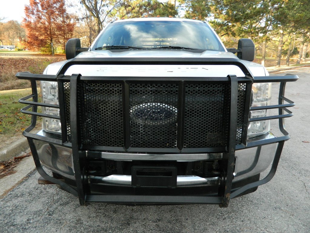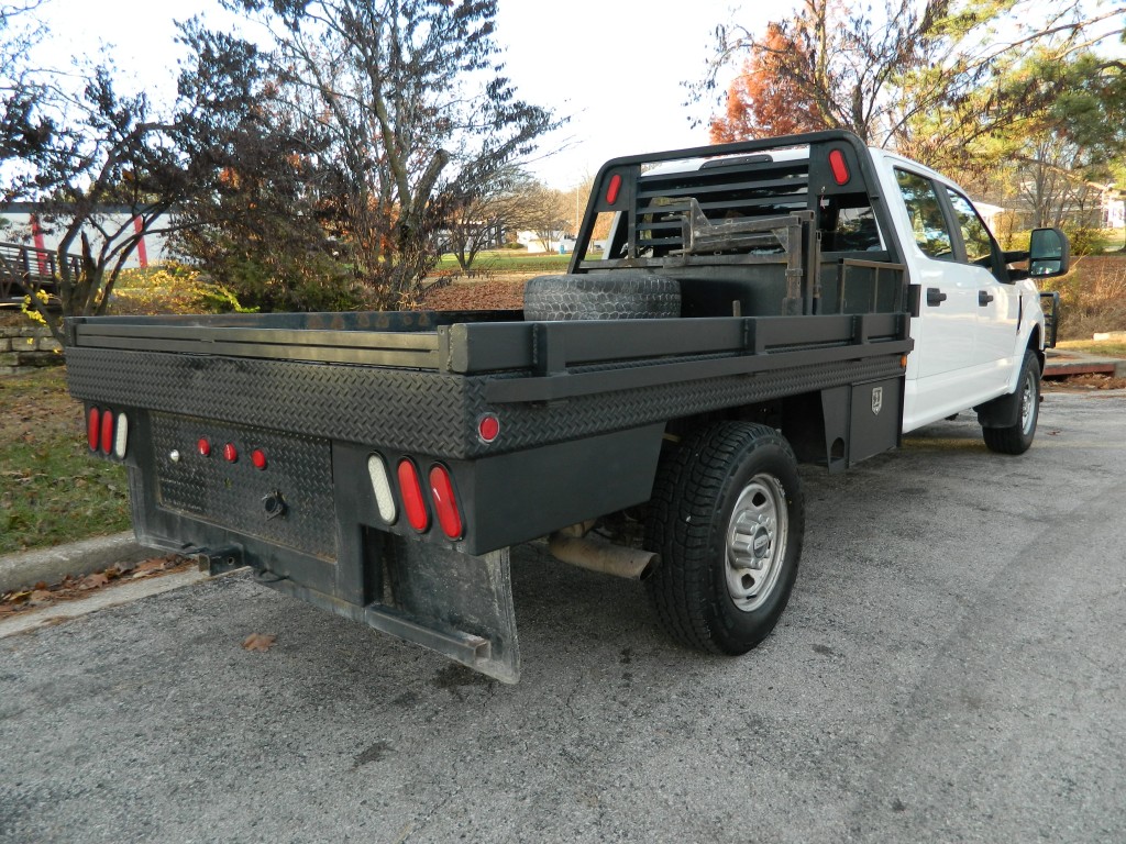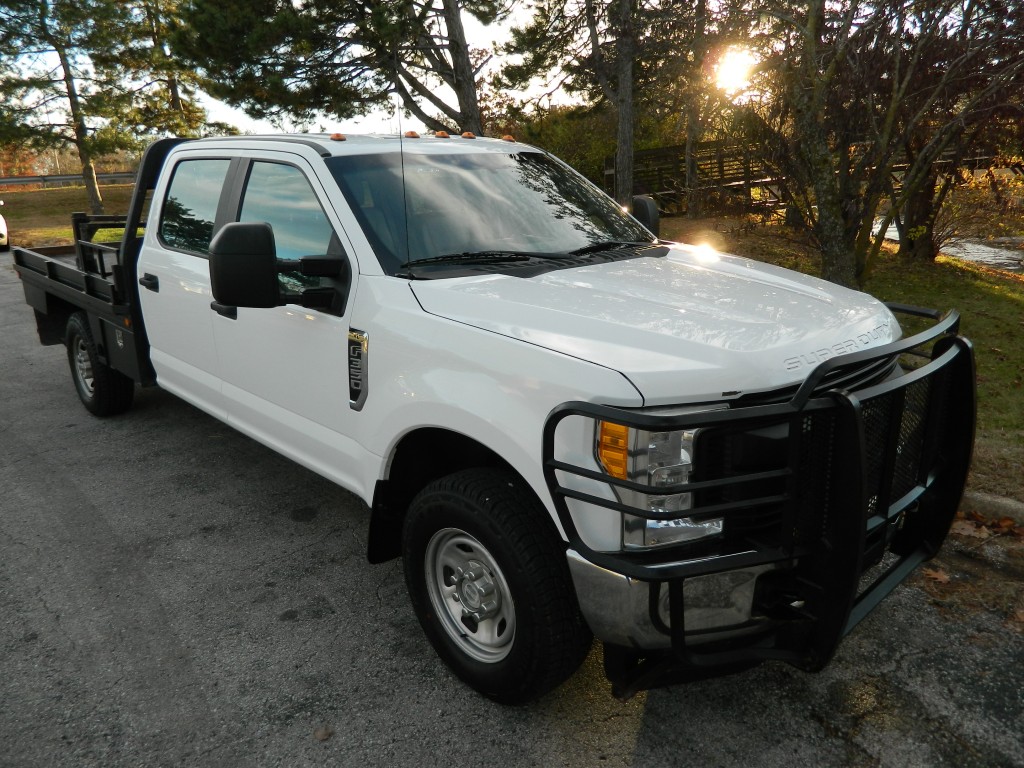 2017 Ford F-350 4x4 Crew Cab and Chassis with a 9.5 ft. flatbed and a headache rack, the XL Value and the 11,400# GVWR packages. It has the 6.2L V8 engine, 6-speed automatic transmission with tow/haul and manual shift modes, manual-select 4-wheel drive with traction control, a 3.73 electronic locking rear axle, steel wheels and a new set of tires. White with chrome and black trim, chrome front bumper, cattle guard, cab marker lights, 9.5 foot flatbed with headache rack, goose neck ball, rear receiver, front tow hooks, tow mirrors and a built-in trailer brake controller. Interior has black vinyl flooring, gray vinyl seats, seating for six, manual windows, door locks and mirrors, good heat and cold A/C, sound system with AM/FM/CD/AUX inputs, tilt and telescopic steering column, cruise control and more.