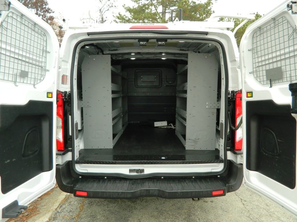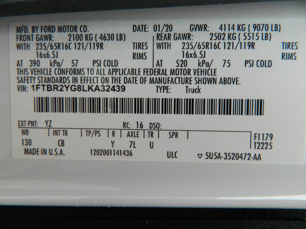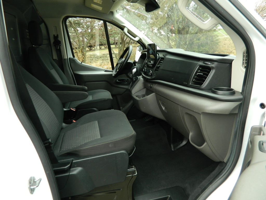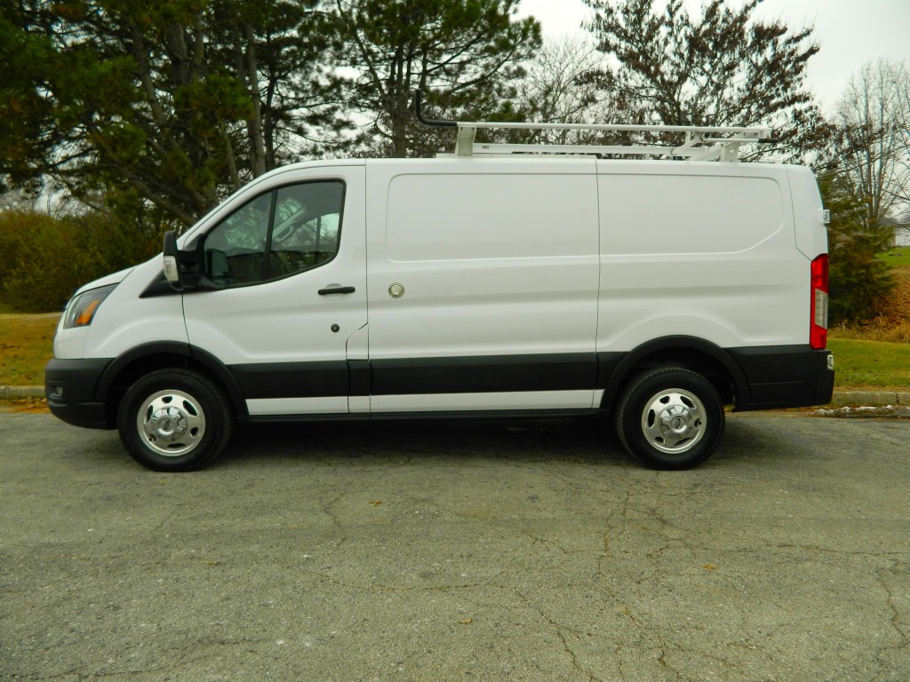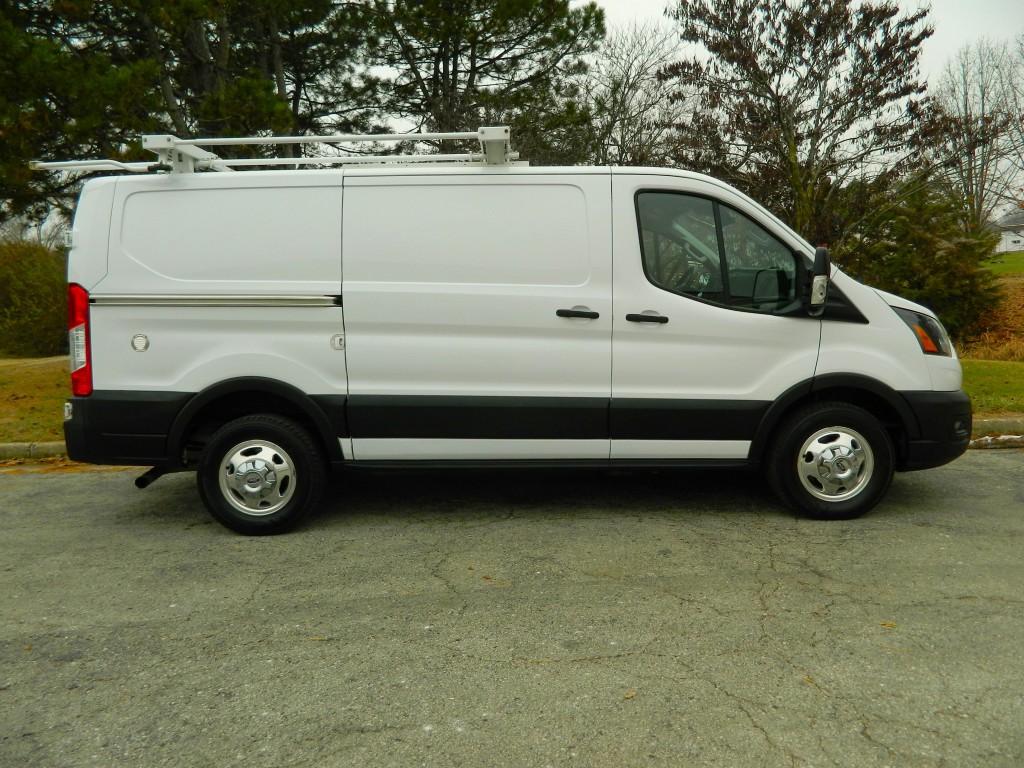 2020 Ford Transit 250 Cargo Van with All Wheel Drive, 130" wheel base, Low Roof and ladder racks. This is a well-serviced, One Owner van. It has the 3.5L Twin Turbo V6 EcoBoost Engine with 295hp and 375ft lbs of torque, the 10-speed automatic transmission with manual shift and multiple drive modes, All Wheel Drive with traction control, a 3.73 limited slip axle, alloy wheels and a new set of tires. White with black trim, fog lights, parking sensors, rear view camera, overhead ladder rack by "Kargo Master". Cargo area has no glass, black vinyl flooring, steel shelving on both sides and a divider protecting the passengers. Passenger area had black vinyl flooring, black cloth seats, seating for two, power windows, door locks and mirrors, good heat and cold A/C, sound system with SYNC-3, 8" touch screen, AM/FM/SAT/USB/BT inputs, tilt and telescopic steering column, steering wheel controls, cruise control and more.