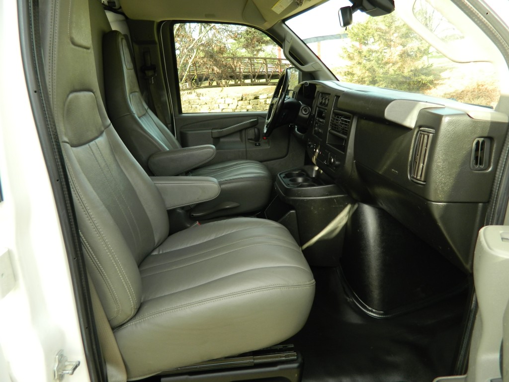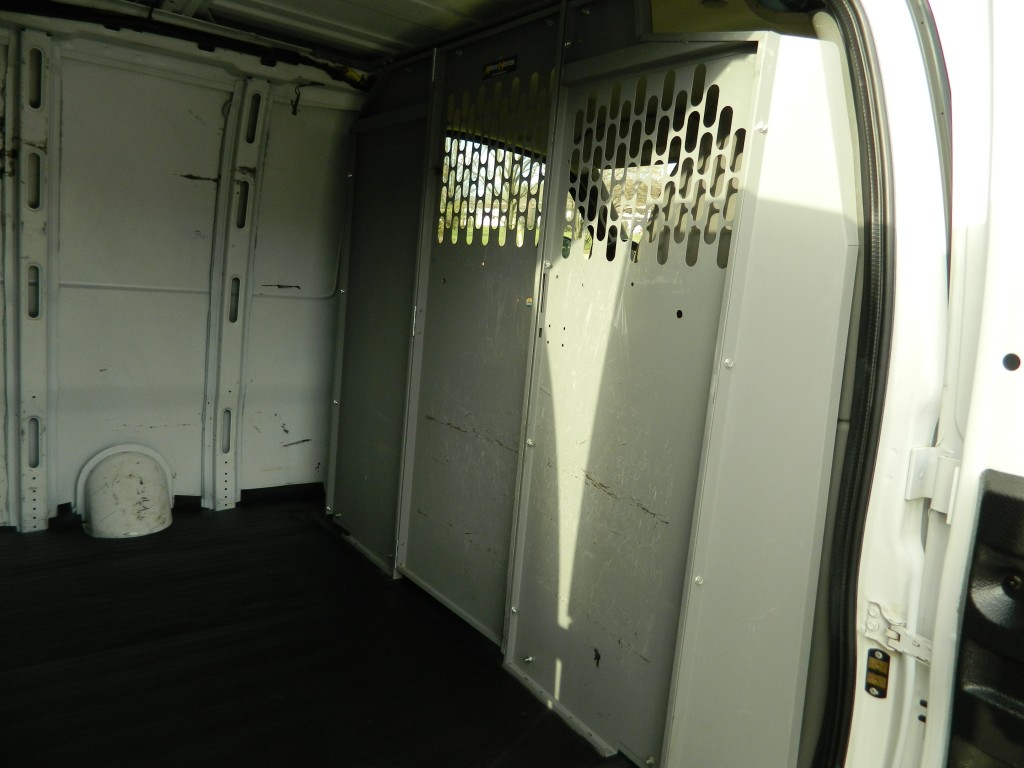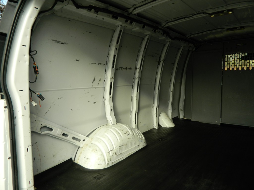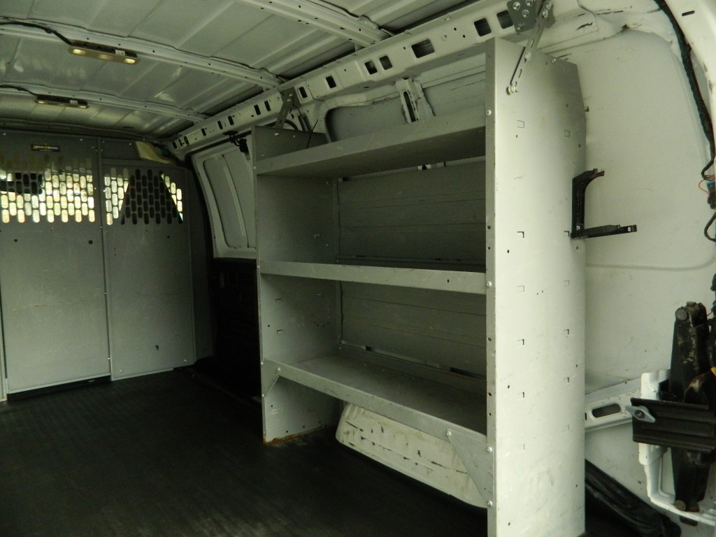 2019 Chevrolet Express 2500 Cargo Van with a ladder rack. This is a one-owner van with an excellent service history and no accidents as reported by Carfax. It has the Vortec 6.0L Flex Fuel V8 engine with 341hp and 373ft lbs of torque, 6-speed automatic transmission (6L-90) with tow/haul and manual shift modes, rear wheel drive with traction control, a 3.42 limited slip rear axle, steel wheels and an excellent set of tires. White with black trim, parking sensors, rear view camera, Ladder rack. Cargo area has solid panels all around (no glass), black vinyl flooring, one steel shelf unit and a steel divider protecting the passengers. Passenger area has black vinyl flooring, gray vinyl seats, seating for two, power windows, door locks and mirrors, good heat and cold A/C, sound system with AM/FM/SAT/CD/AUX/BT inputs, tilt steering, steering wheel controls, cruise control and more.