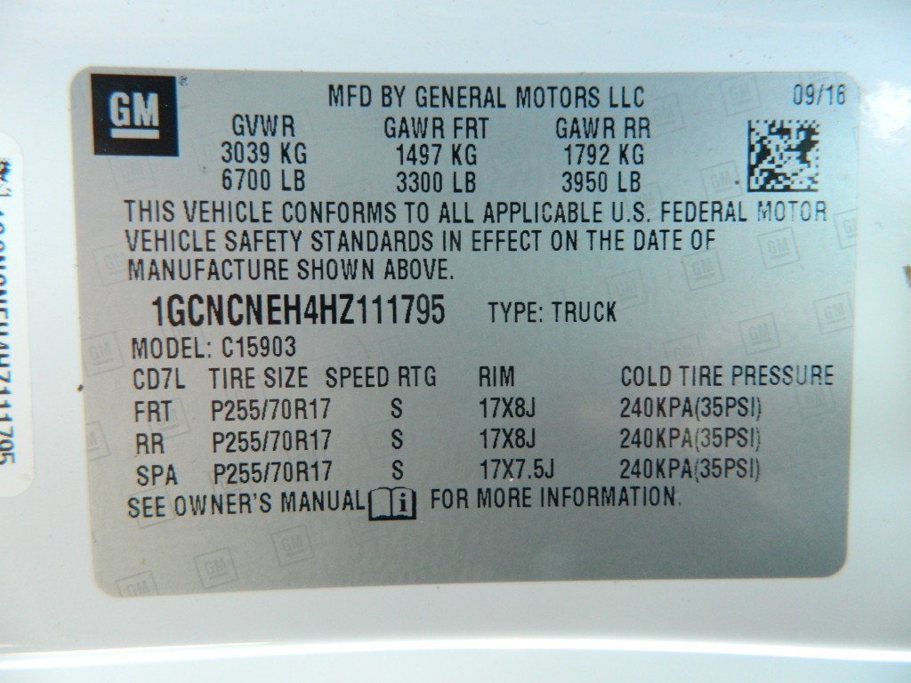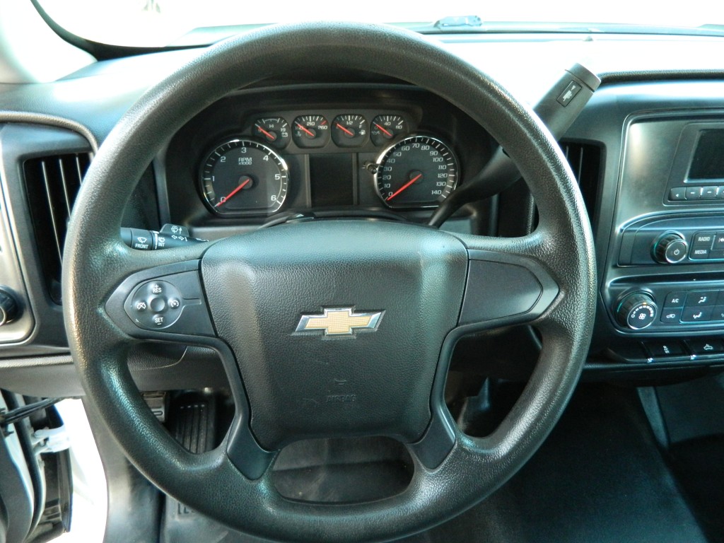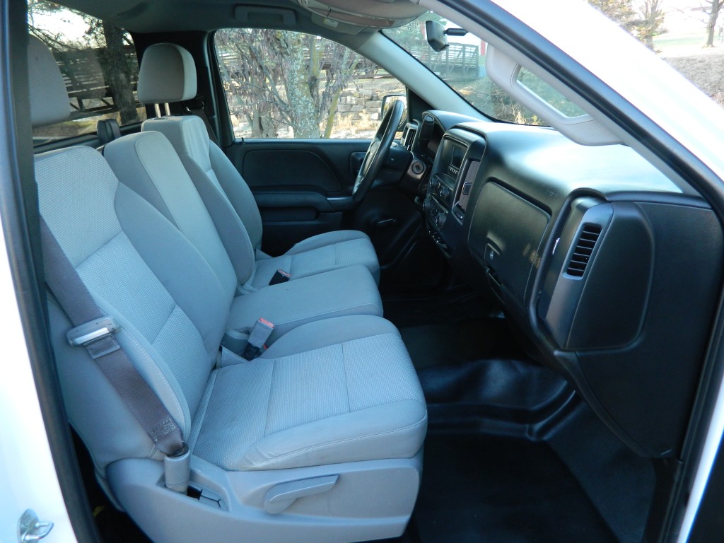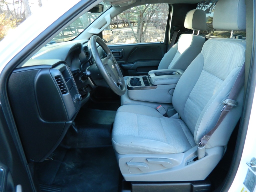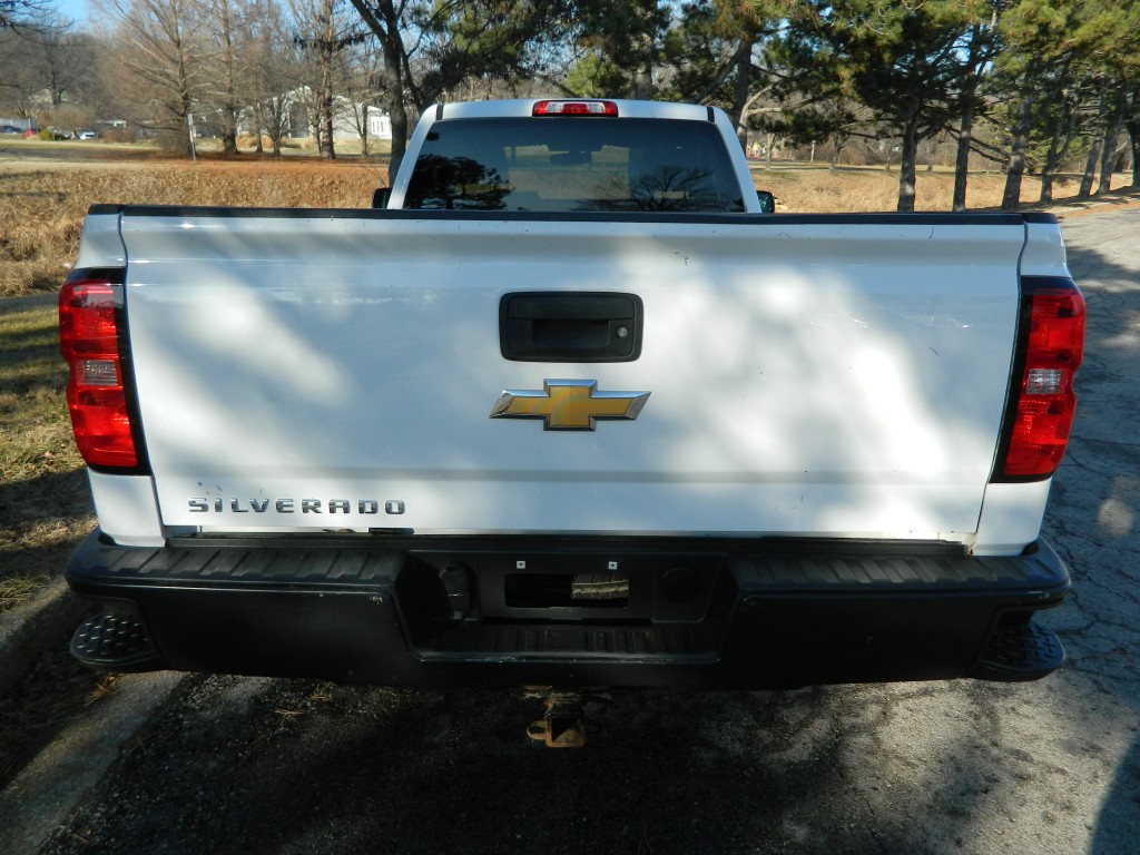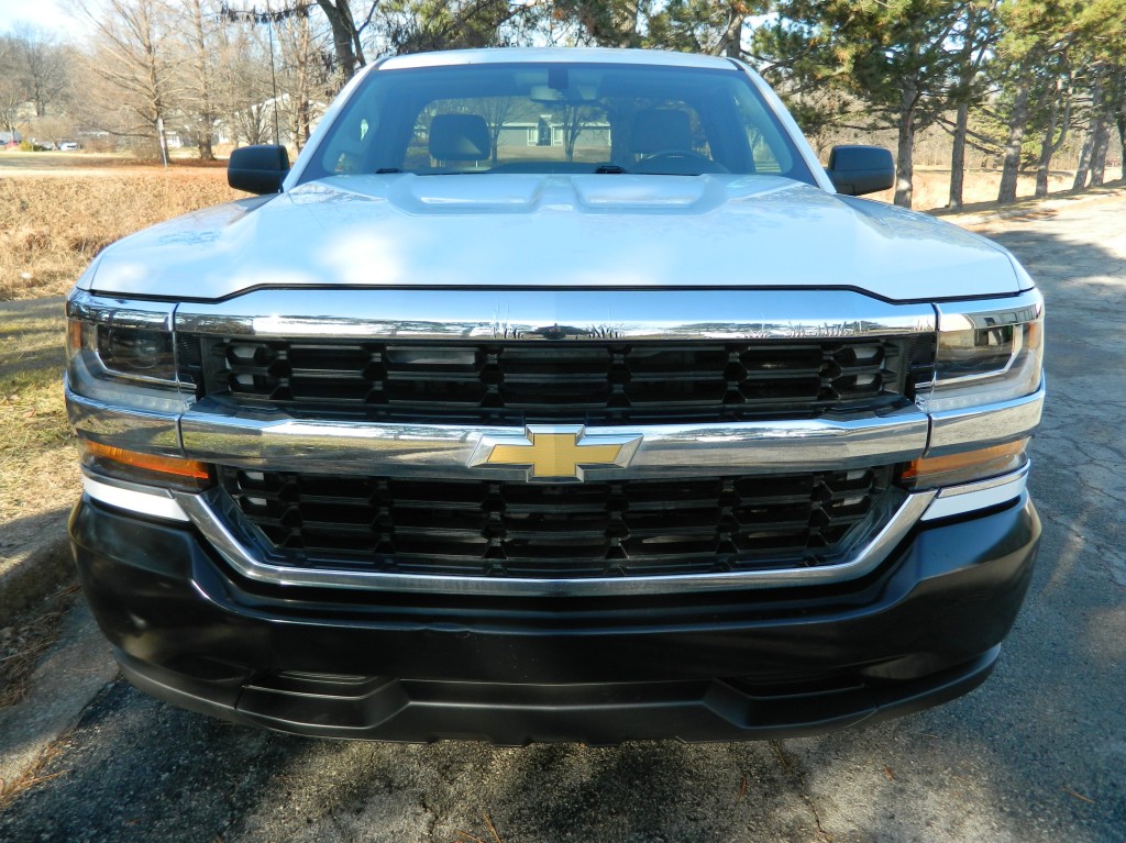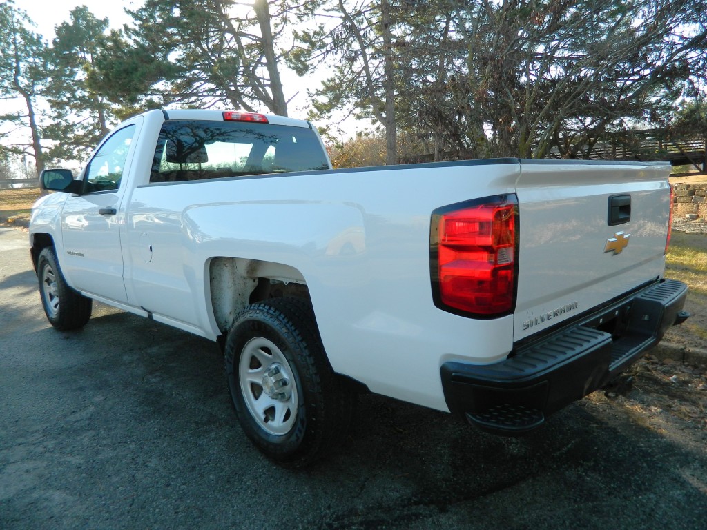 2017 Chevrolet Silverado 1500 WT, Regular Cab, Rear Wheel Drive, Long Bed. A one-owner, well-serviced truck with no accidents as reported by Carfax. It has the 4.3L Flex Fuel V6 EcoTec3 engine with 285hp and 305ft lbs of torque, 6-speed automatic transmission (6L-80) with tow/haul and manual shift modes, rear wheel drive with traction control, a 3.23 axle ratio, steel wheels and an excellent set of tires. White with black and chrome trim, 8-foot bed with bed liner and a rear receiver. Interior has black vinyl flooring, gray cloth seats, seating for three, manual windows and mirrors, power door locks, good heat and cold A/C, sound system with AM/FM/SD/USB/AUX inputs, tilt steering, cruise control and more.