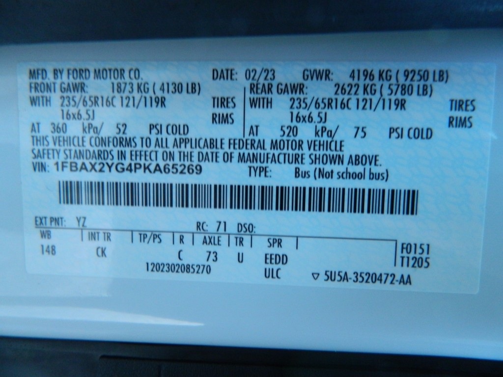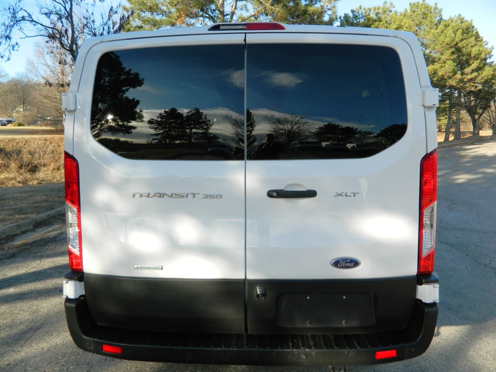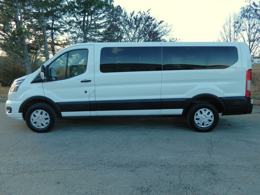 2023 Ford Transit 350 XLT 12-passenger van, powered running board, 148" wheel base and the 9,250# GVWR a very nice, one-owner passenger van with no accidents as reported by Carfax. It has the 3.5L Twin Turbo V6 EcoBoost engine with 310hp and 400ft lbs of torque, 10-speed automatic transmission with manual shift and multiple drive modes, rear wheel drive with traction control, a 3.73 axle ratio, steel wheels and a new set of tires. White with black trim, fog lights, privacy glass, Blind Spot Assist, Lane Keeping System, front and rear parking sensors, powered running board, rear view camera. Interior has black carpet, black cloth seats, seating for twelve, power windows, door locks and mirrors, front and rear climate control, entertainment system with AM/FM/SAT/BT, Apple CarPlay, Android Auto, SYNC 4, tilt and telescopic steering column, steering wheel controls, cruise control and a lot more.