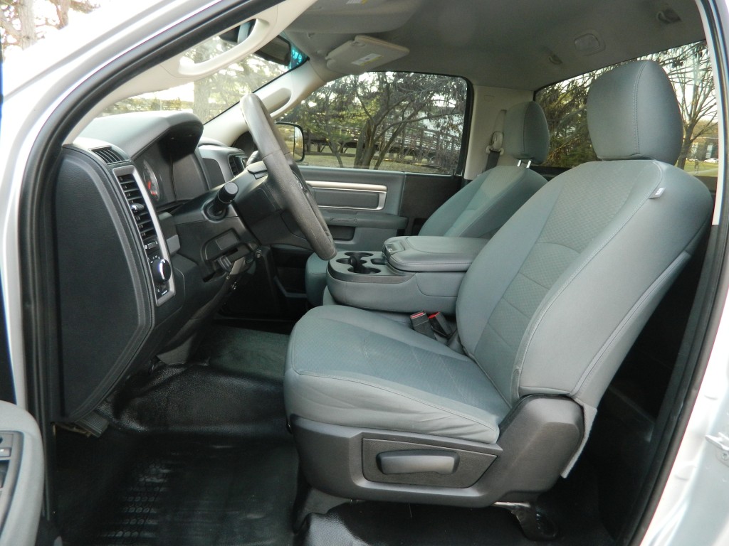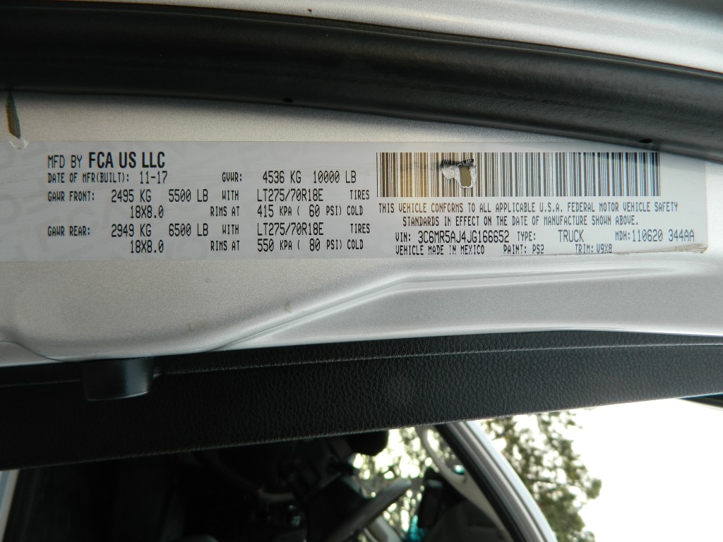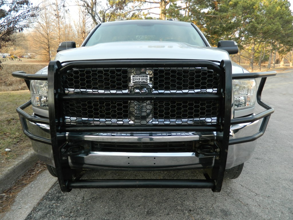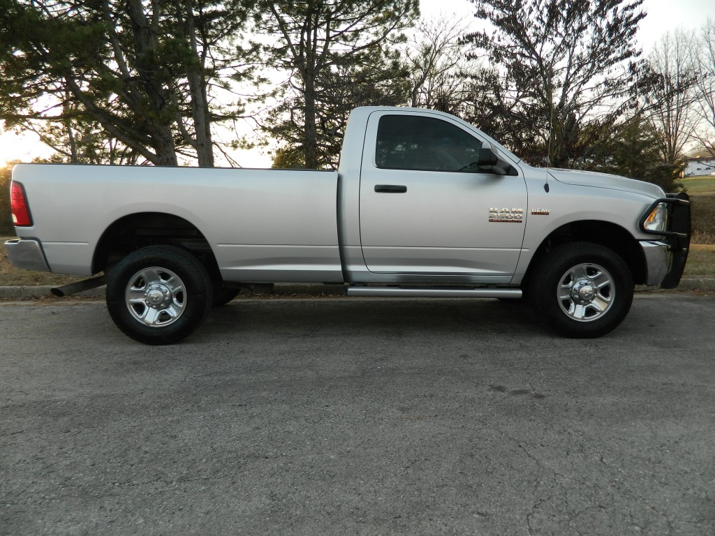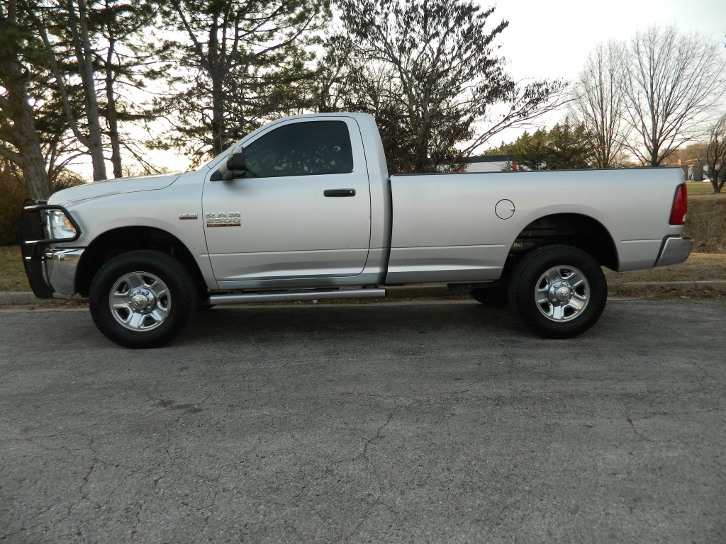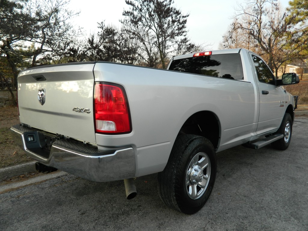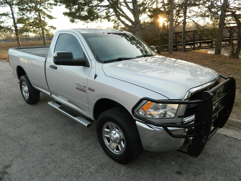 2018 Ram 2500 ST Regular Cab, 4-wheel drive with a long bed, 10,000# GVWR. It has the 6.4L V8 Hemi engine with 410hp and 429ft lbs of torque, 6-speed automatic transmission (66RFE) with tow/haul and manual shift modes, 4-wheel drive with traction control, a 3.73 Anti-Spin rear axle, Chrome Clad Steel Wheels and an excellent set of tires. Silver with chrome and black trim, running boards, a "Ranch Hand" cattle guard, chrome bumpers, 8-foot bed, rear view camera, rear receiver, goose neck receiver, front tow hooks, tow mirrors and a built-in trailer brake controller. Interior has black vinyl flooring, gray cloth seats, seating for three, power windows, door locks and mirrors, good heat and cold A/C, sound system with AM/FM/SAT/USB/AUX/BT inputs, tilt steering, steering wheel controls, cruise control and more.