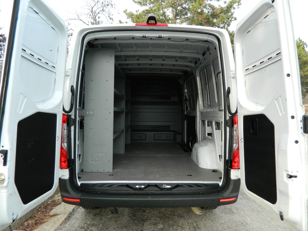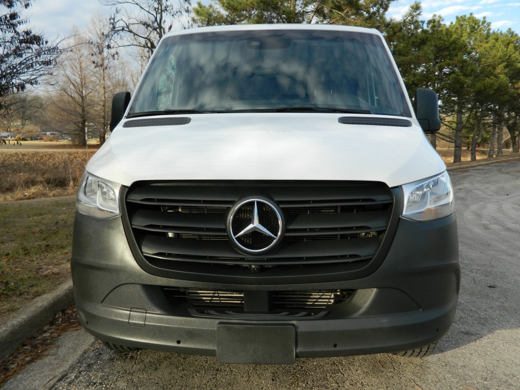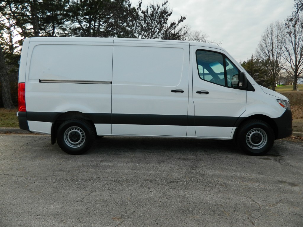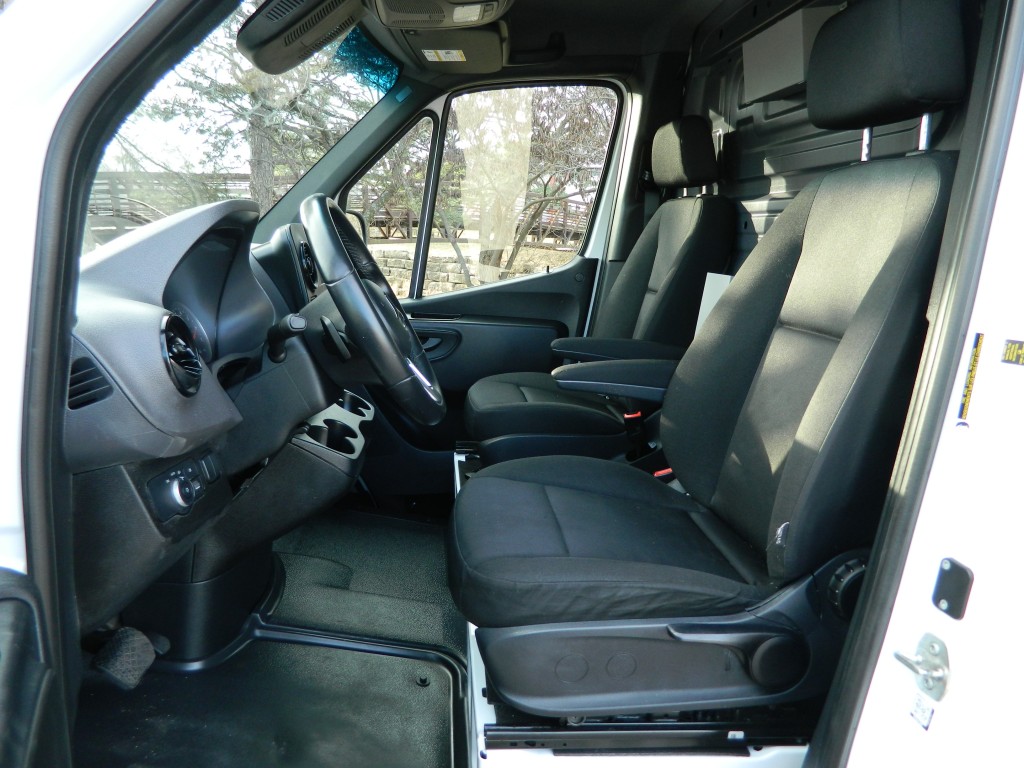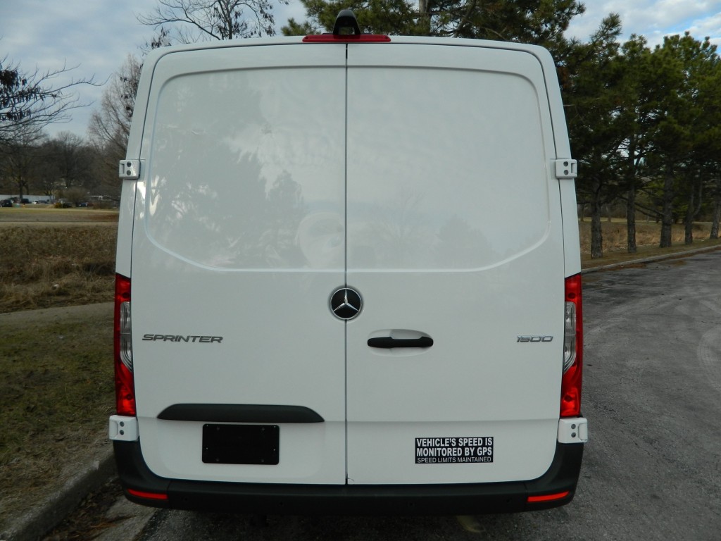 2022 Mercedes Benz Sprinter 1500, Full-Sized Cargo Van, 1-owner, fleet-serviced vehicle. It has the 2.0L Turbocharged Inline 4 cylinder engine with 188hp and 258ft lbs of torque, 9-Speed automatic transmission (9G-TRONIC), rear wheel drive with traction control, a 3.92 axle ratio, steel wheels, excellent set of tires, 8550# GVWR, 4 Cameras front, sides and rear, front and rear parking sensors. Cargo area has a gray hard vinyl floor, is 10' 8" deep, 5' 4" head clearance and 4' 5" between the wheel wells and has a shelf unit down the driver's side and a divider protecting the passenger area. Passenger compartment has black vinyl flooring, black cloth seats, seating for two, power windows, door locks and mirrors, good heat and cold A/C, sound system with AM/FM/USB/BT inputs, Apple Car Play, Android Auto, tilt and telescopic steering column, steering wheel controls, cruise control and a lot more.