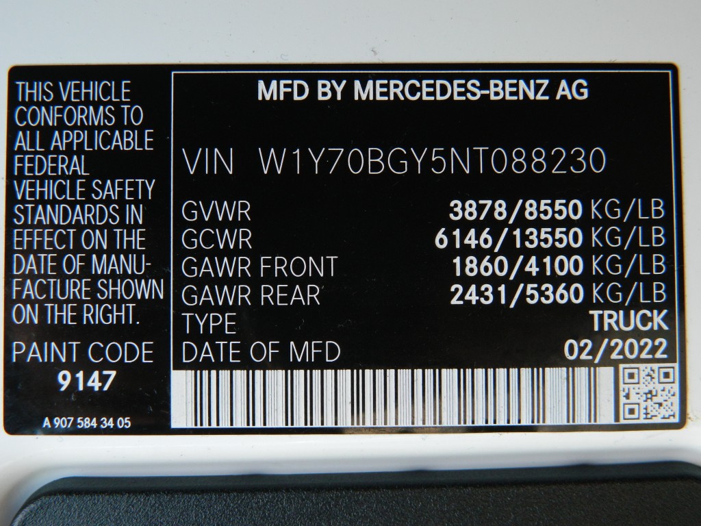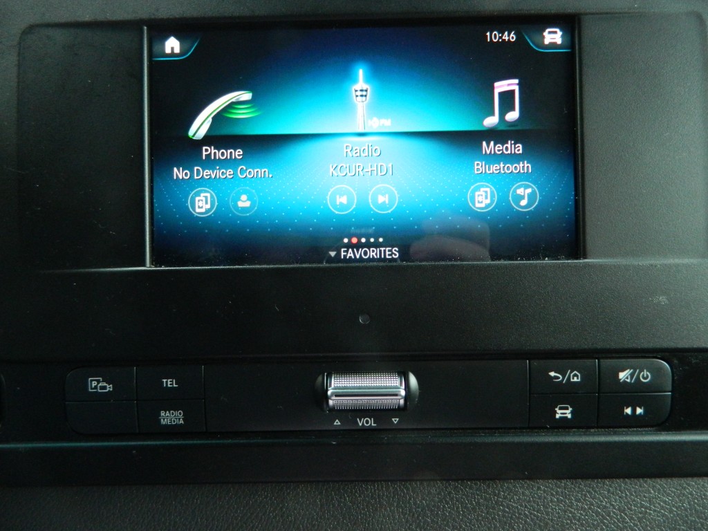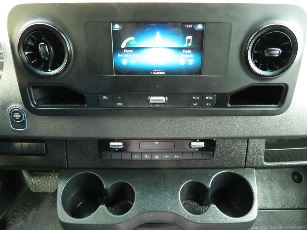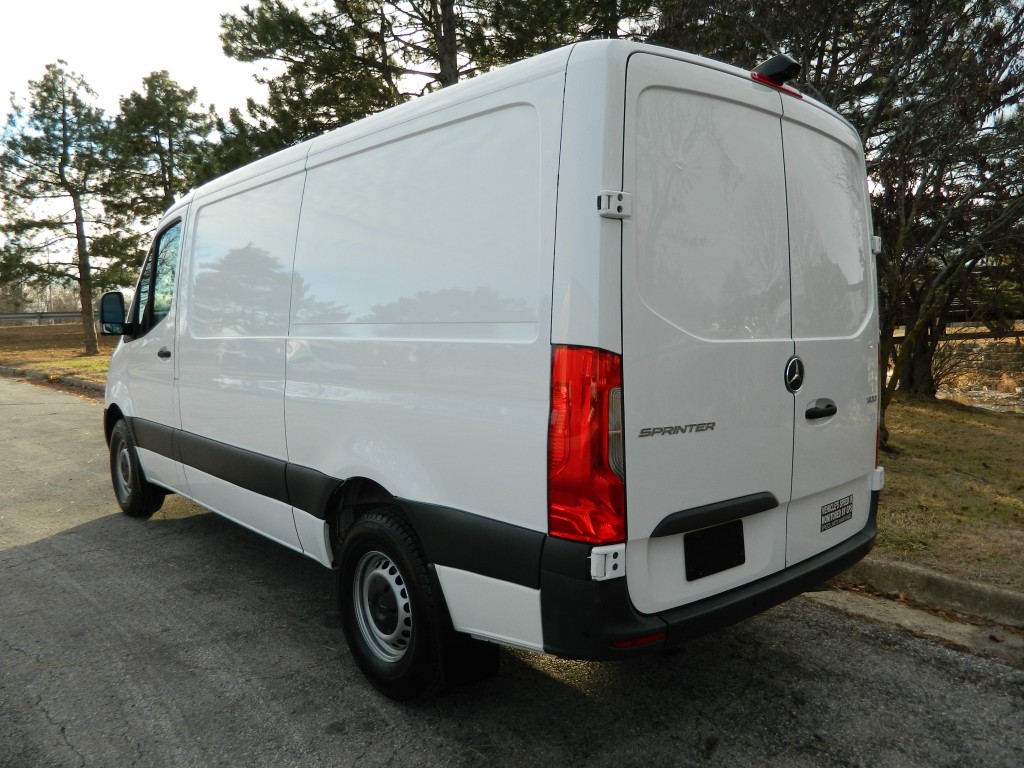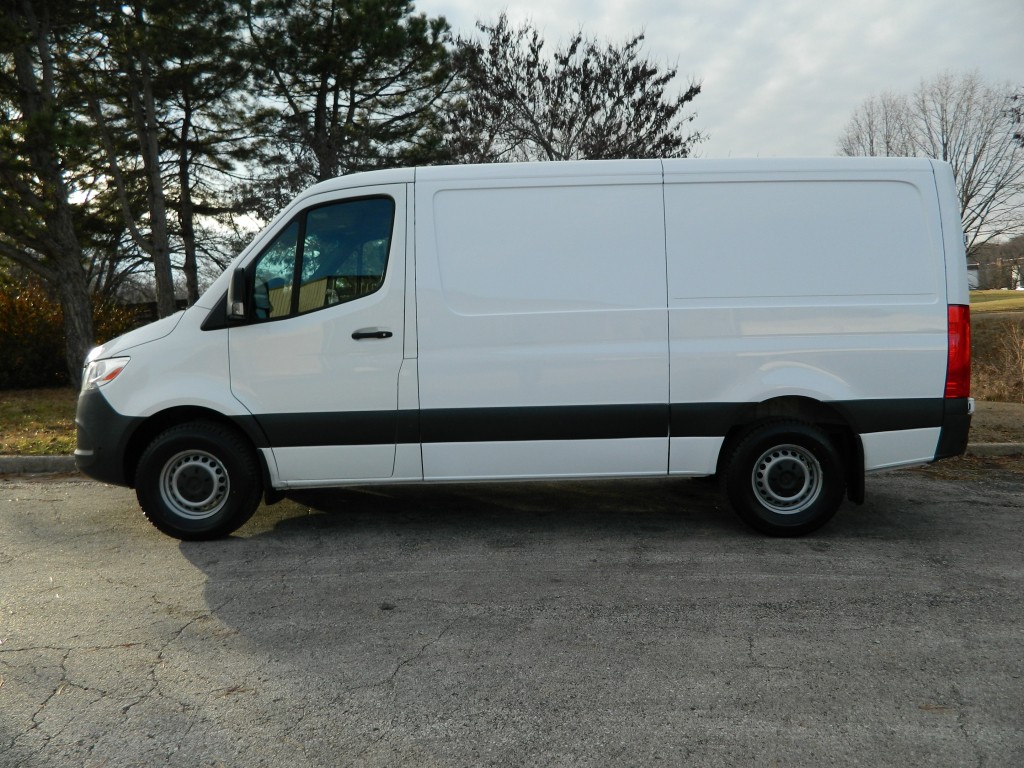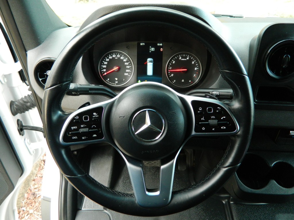 2022 Mercedes Benz Sprinter 1500, Full-Sized Cargo Van, 1-owner, fleet-serviced vehicle. It has the 2.0L Turbocharged Inline 4 cylinder engine with 188hp and 258ft lbs of torque, 9-Speed automatic transmission (9G-TRONIC), rear wheel drive with traction control, a 3.92 axle ratio, steel wheels, excellent set of tires, 8550# GVWR, 4 Cameras front, sides and rear, front and rear parking sensors. Cargo area has a gray hard vinyl floor, is 10' 8" deep, 5' 4" head clearance and 4' 5" between the wheel wells and has a shelf unit down the driver's side and a divider protecting the passenger area. Passenger compartment has black vinyl flooring, black cloth seats, seating for two, power windows, door locks and mirrors, good heat and cold A/C, sound system with AM/FM/USB/BT inputs, Apple Car Play, Android Auto, tilt and telescopic steering column, steering wheel controls, cruise control and a lot more.